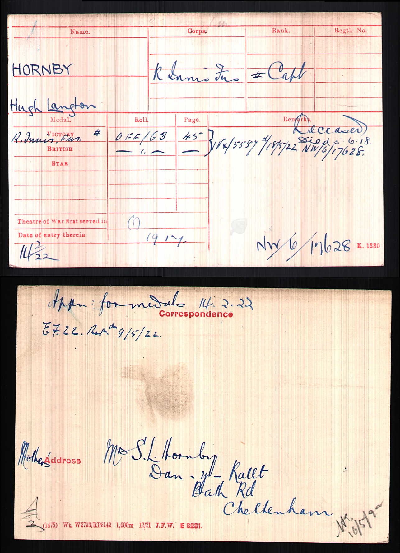 Died of wounds, received at Messines June 6, 1917 |