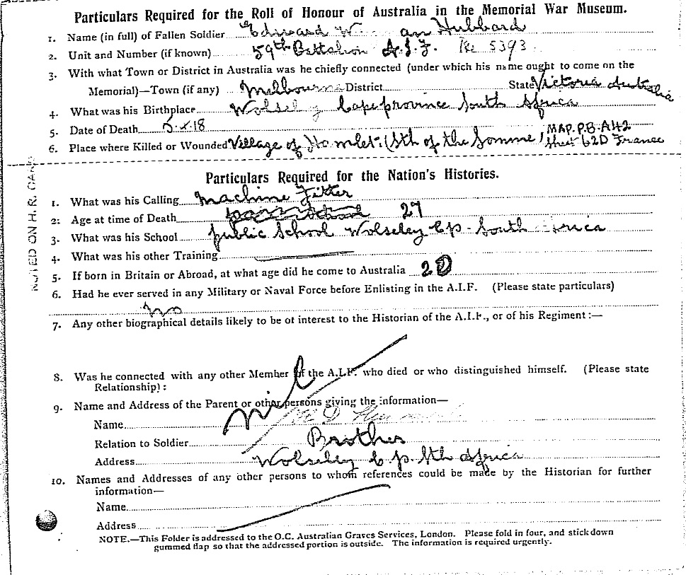 Son of Louis Alfred and Margaret Johanna Hubbard. Born Wolseley, South Africa. A machine fitter |