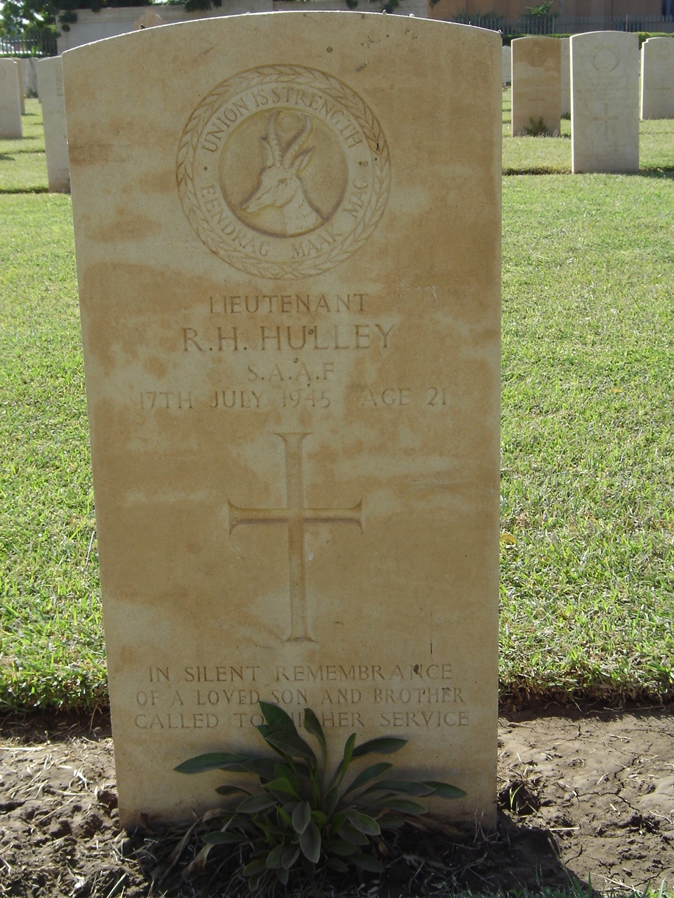 Son of Harden W. and Violet E. Hulley, of Paddock, Natal, South Africa. Born Matatiele, South Africa. He attested into the South African Air Force on 22 January 1942, having previously been a Scholar, becoming an Air Pupil. He was confined to barracks on two separate occasions in 1942 firstly on 7 September and again on the 5 November with 5 days and 7 days respectively for minor offences. Hulley became a Pupil Pilot on 19 December 1942 and a Second Lieutenant Pilot on 26 September 1943 with 24 A/S.. He was posted to MAFD on 27 September 1943 and then to 61 A/S. Hulley was posted from MAFD to ME on 17 January 1944 and deplaned at Cairo on 20 January 1944, the same day he moved from MAFD to the SAAF Base depot. On 21 February 1944 he went to R.A.F. Station Shanduv and on 21 April he went to the SAAF Adv Tv Camp. Hulley was posted to No. 21 Squadron on 3 May 1944 firstly flying Baltimore aircraft and then Marauder aircraft. He is confirmed as Pilot for the attack on 1 July 1944 on Road Bridge at S 398362, and was a pilot twice on raids on the Lugo Marshalling Yards on 2 July 1944. The following day he was on the raid on Corsini Harbour, followed by a raid on the 6 July 1944 on the raid on Faenza. The remainder of the month saw consistent bombing attacks on Gun Positions and Road Bridges with an emphasis on the Ancona region. The Squadron began training on Marauder aircraft and converted in a record 28 days having completed this task by the 15 August 1944. Hulley was part of the raid on the Forli Marshalling Yards on 25 August 1944 and on the Pesaro Gun areas each day from 26-29 August 1944 inclusive. For September 1944 he participated in 16 assorted missions to include attacking the Gothic Line and with detailed attacks on the Rimini area with the emphasis on gun positions. His final raid was on the Forli Mashalling yards on the 24 September 1944. He was posted on 5 October 1944 to the S.A.A.F. Base Depot back in South Africa. |