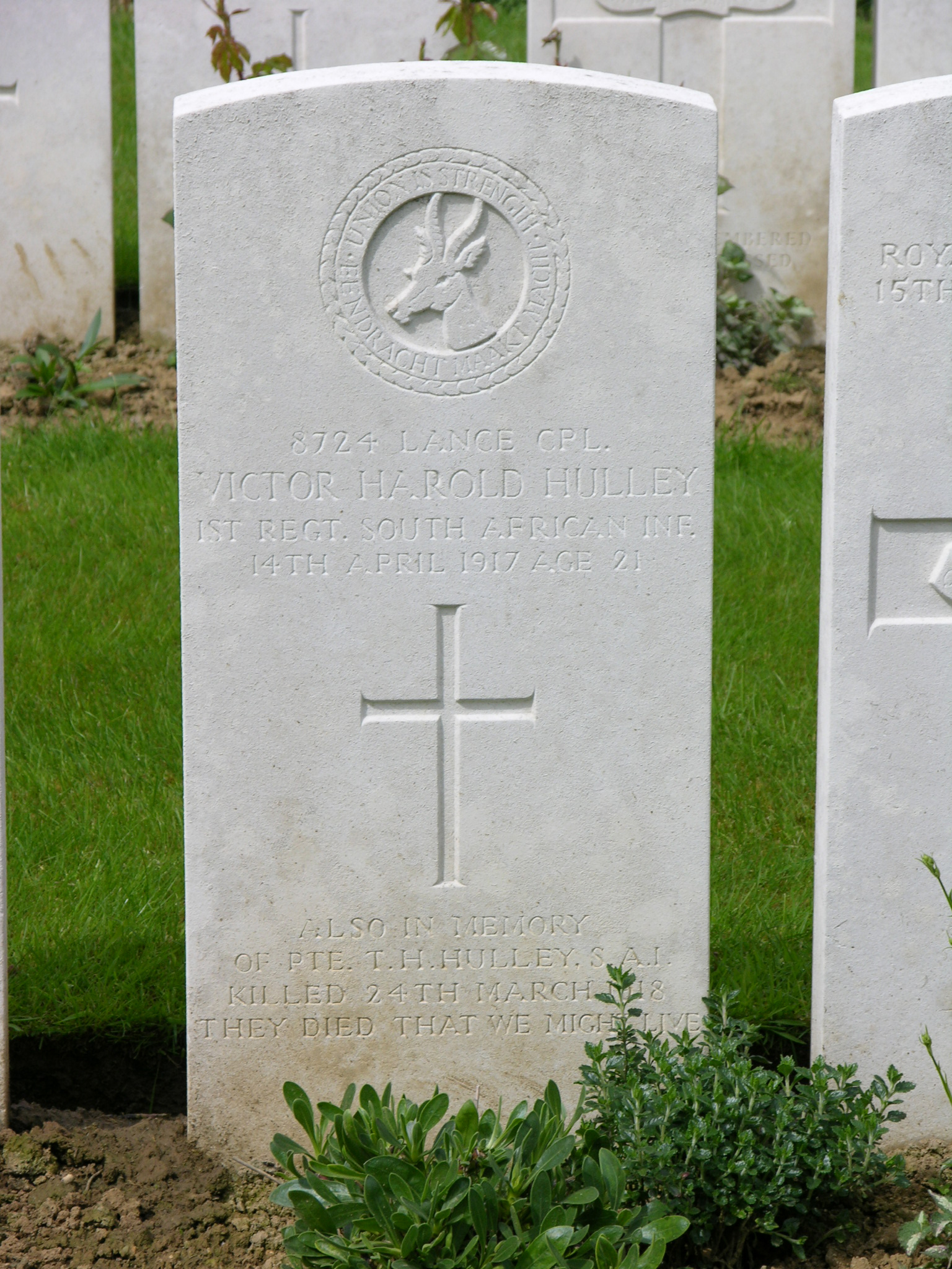 Son of Thomas Henry and Sarah Hulley, of 57, Robinson St., Beaconsfield, Cape Province. His brother Thomas Henry Hulley also fell.