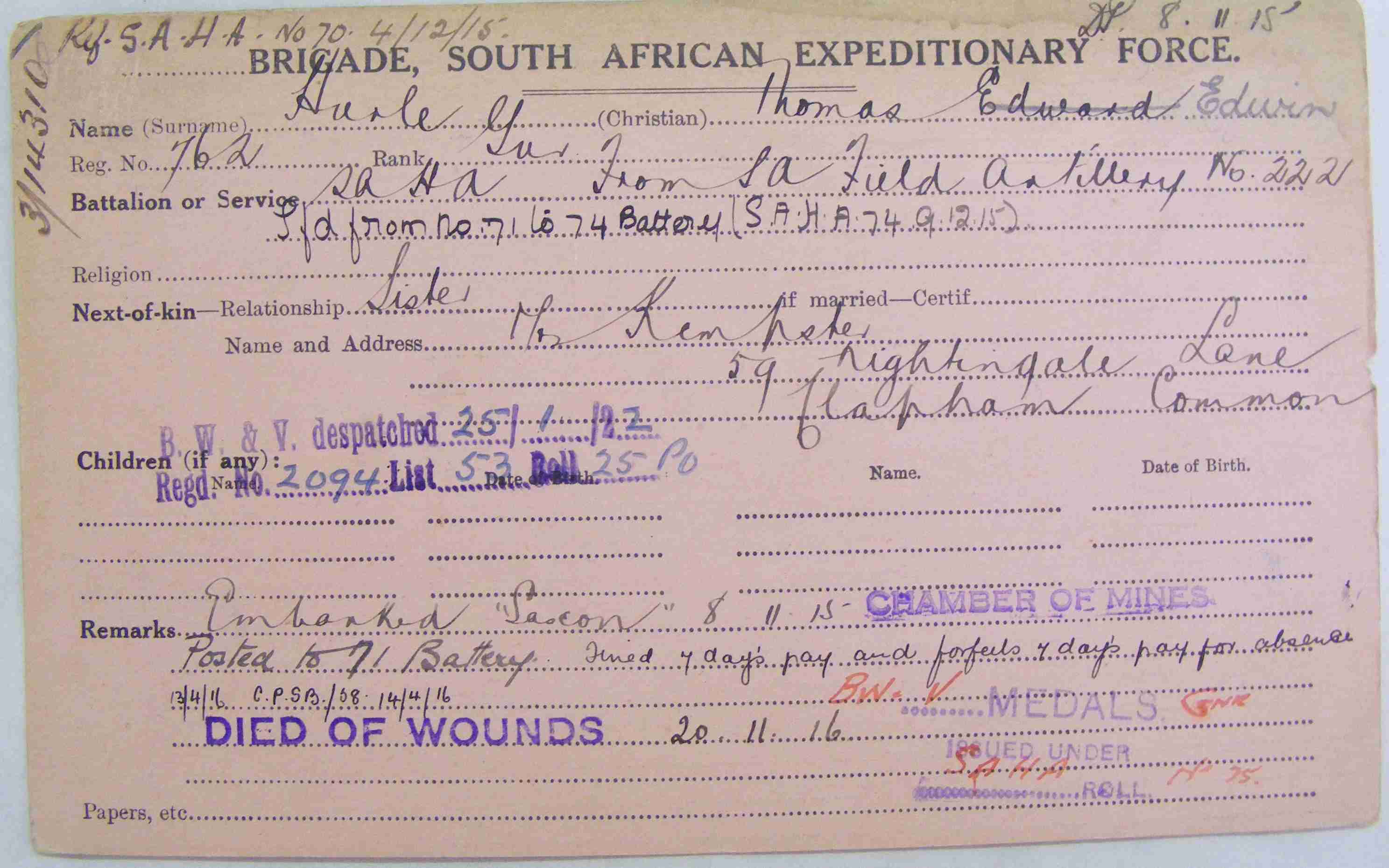 Died of wounds. The Battery was at Colincamp since the 7th October 1916 in a position really untenable for a heavy battery, without cover and a favourite target for the German artillery. On the 20th November, the enemy kept up a severe bombardment all day, and four gunners were killed (the three men buried at Courcelles and Bombardier Frank Birt buried in Couin British Cemetery). |