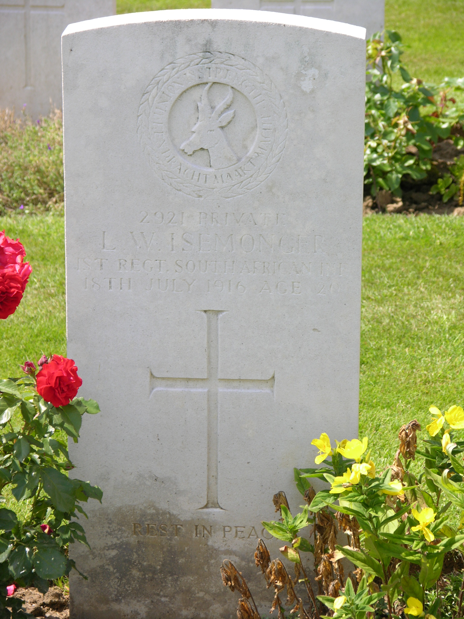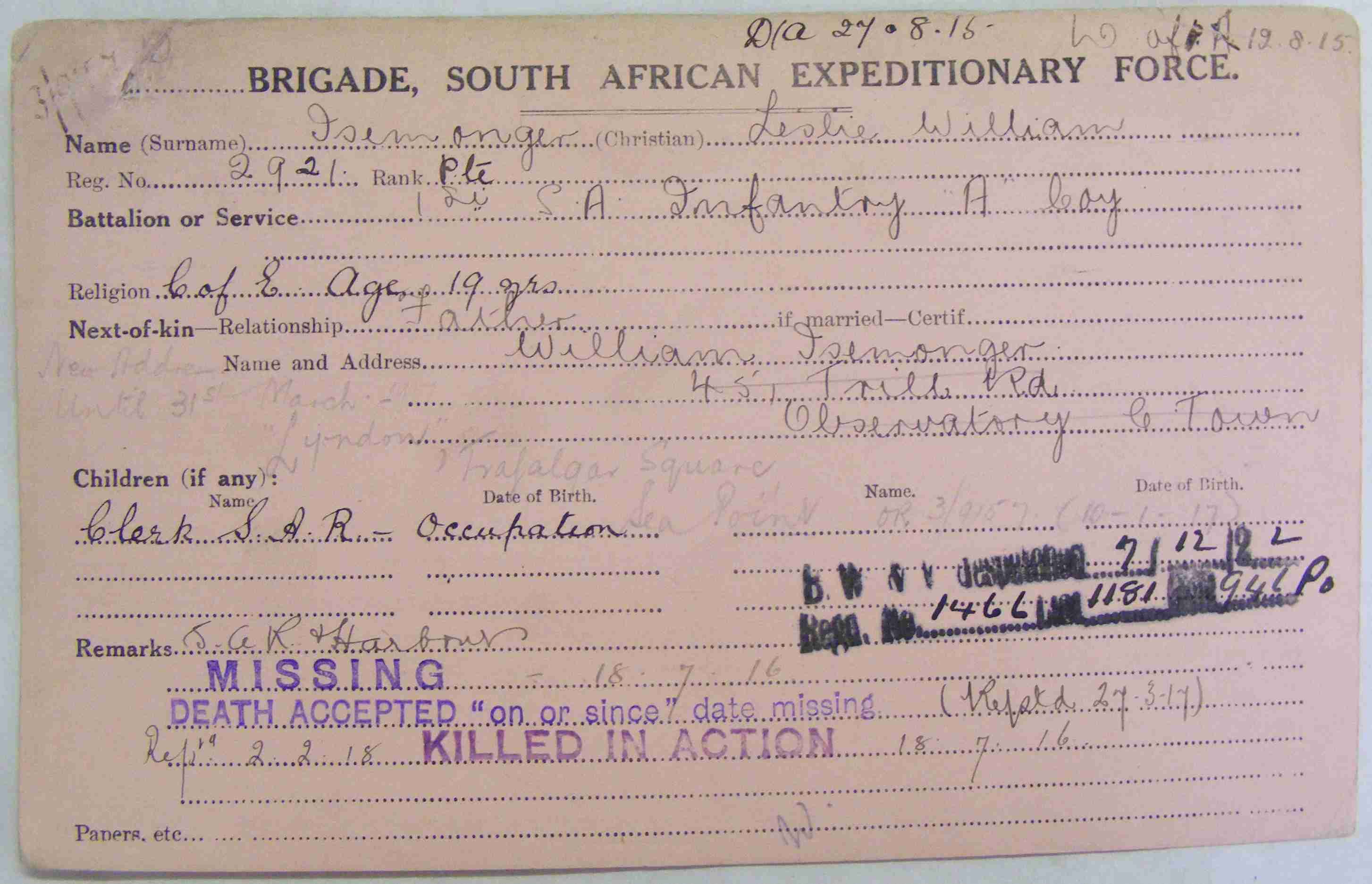 Son of William and Annie Isemonger, of 45, Trill Rd., Observatory, Cape Town. |