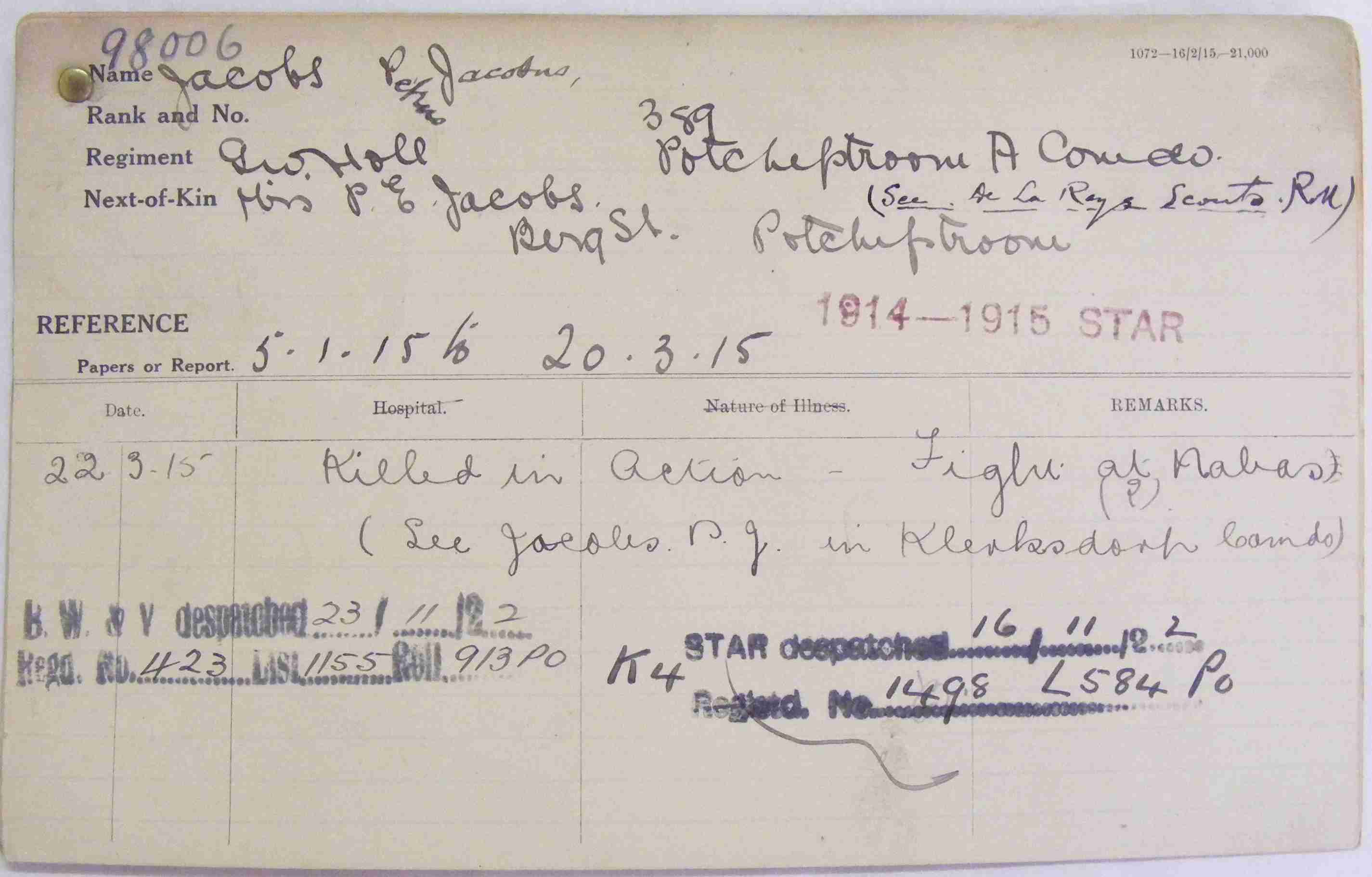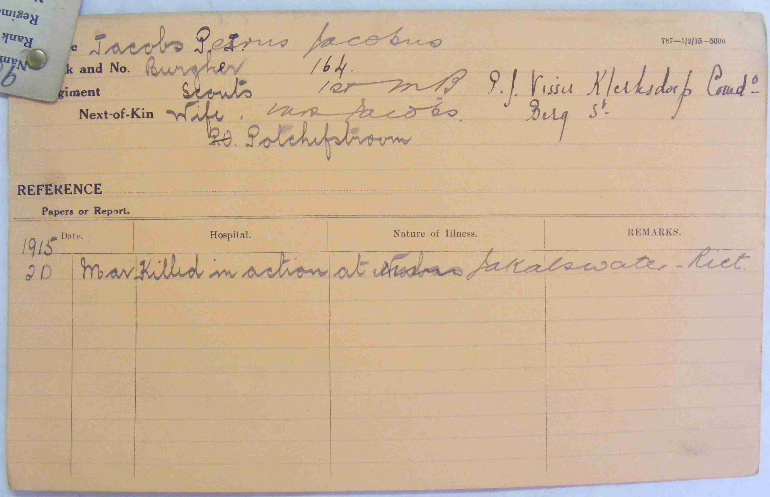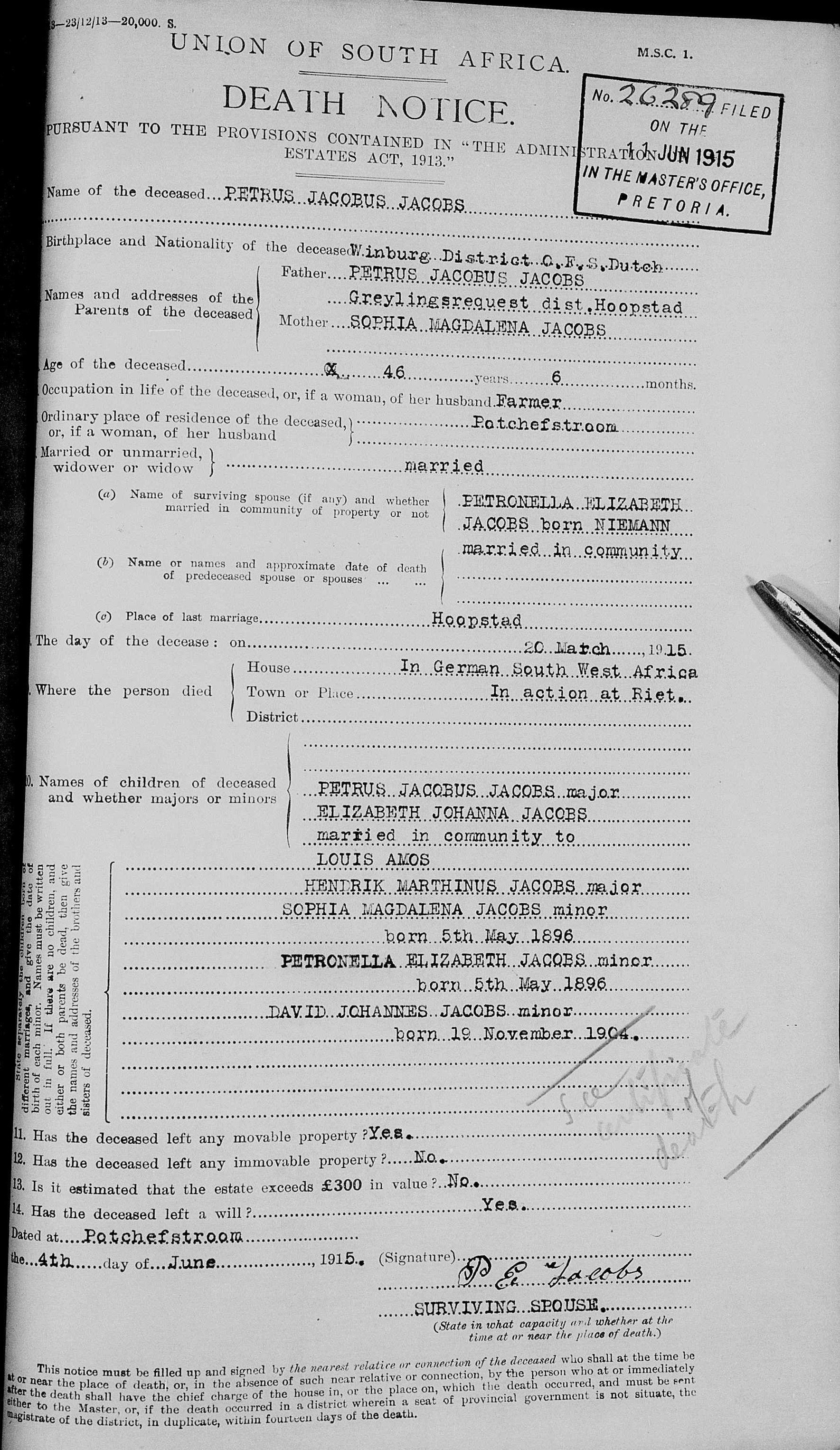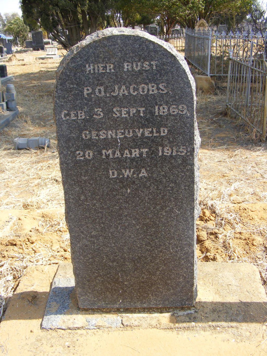 Son of Petrus Jacobus and Sophia Magdalena Jacobs, of Greylingsrequest, District Hoopstad. Husband of Petronella Elizabeth Jacobs (nee Niemann), of Berg Street, Potchefstroom.