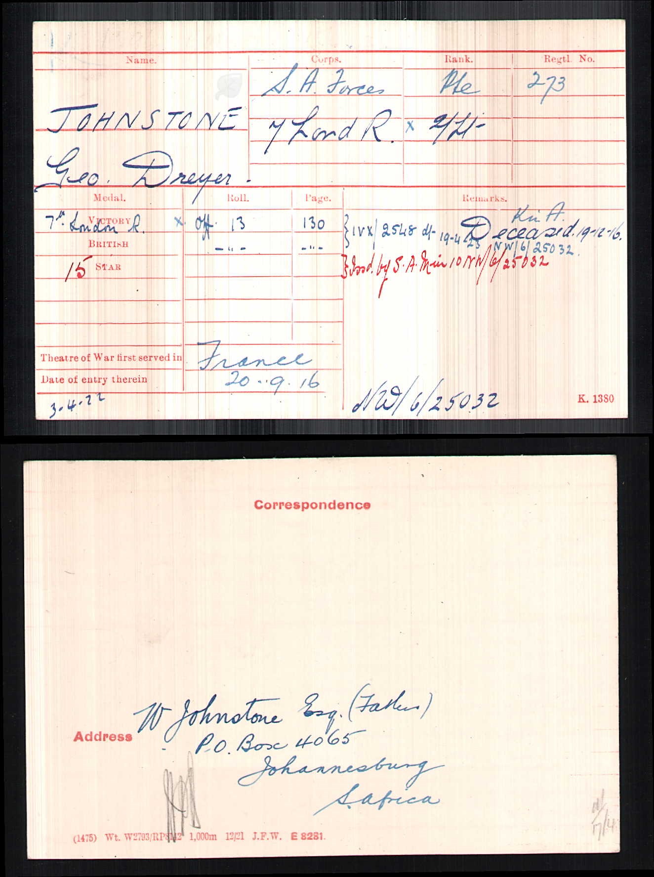 Son of William and Eugenie Johnstone, of Johannesburg, Transvaal, South Africa. Served with the 1st Transvaal Scottish in German South West Africa, 1914-1915. His brother also died on service