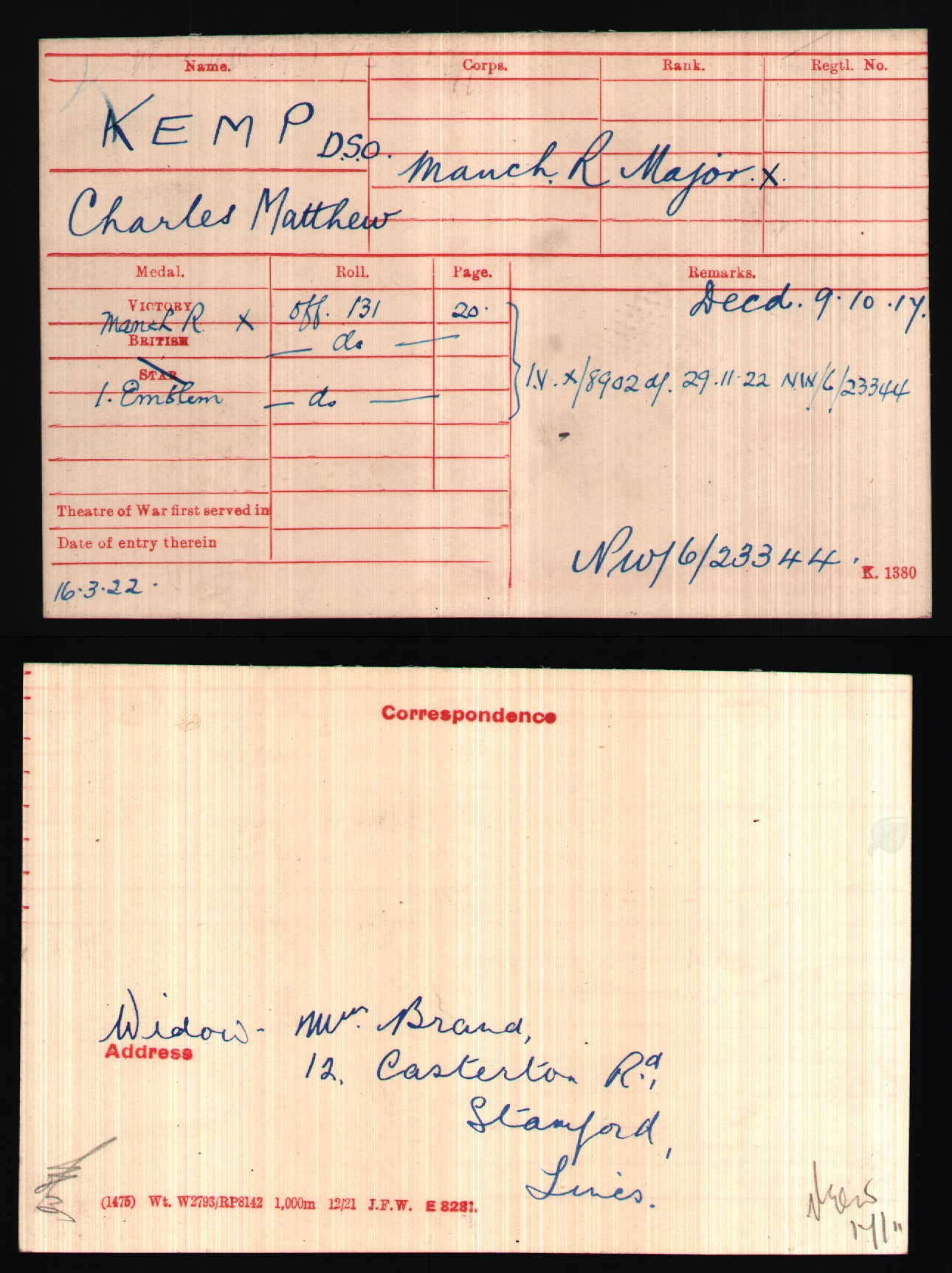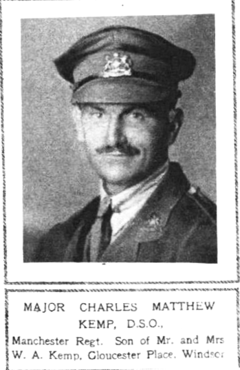Son of William Arthur and Eliza Kemp, of 11 Gloucester Pace, Windsor, Berkshire, England. Husband of Winnifred May Brand, of 12 Casterton Rd., Stamford, Lincolnshire, England. Born Windsor, England. Served as Lance Corporal (#23243) with the 28th Company, 4th Battalion, Imperial Yeomanry in the ABW 1899-1902. Attested with Natal Police 3 March 1903. Stationed HQ Pretoria. Seconded to SA Defence Force 21 September 1914. Second in Command (Major) 21st Bn. Manchester Regiment. Commemorated on St. Saviour's Anglican Cathedral, Pietermaritzburg WWI Memorial scroll in St. Peter's Presbyterian Church, Pietermaritzburg & on WWI Memorial in the grounds of St. John the Baptist Church, Windsor, Berkshire, England. ref. South African Roll of Honour 1914-1918 |
