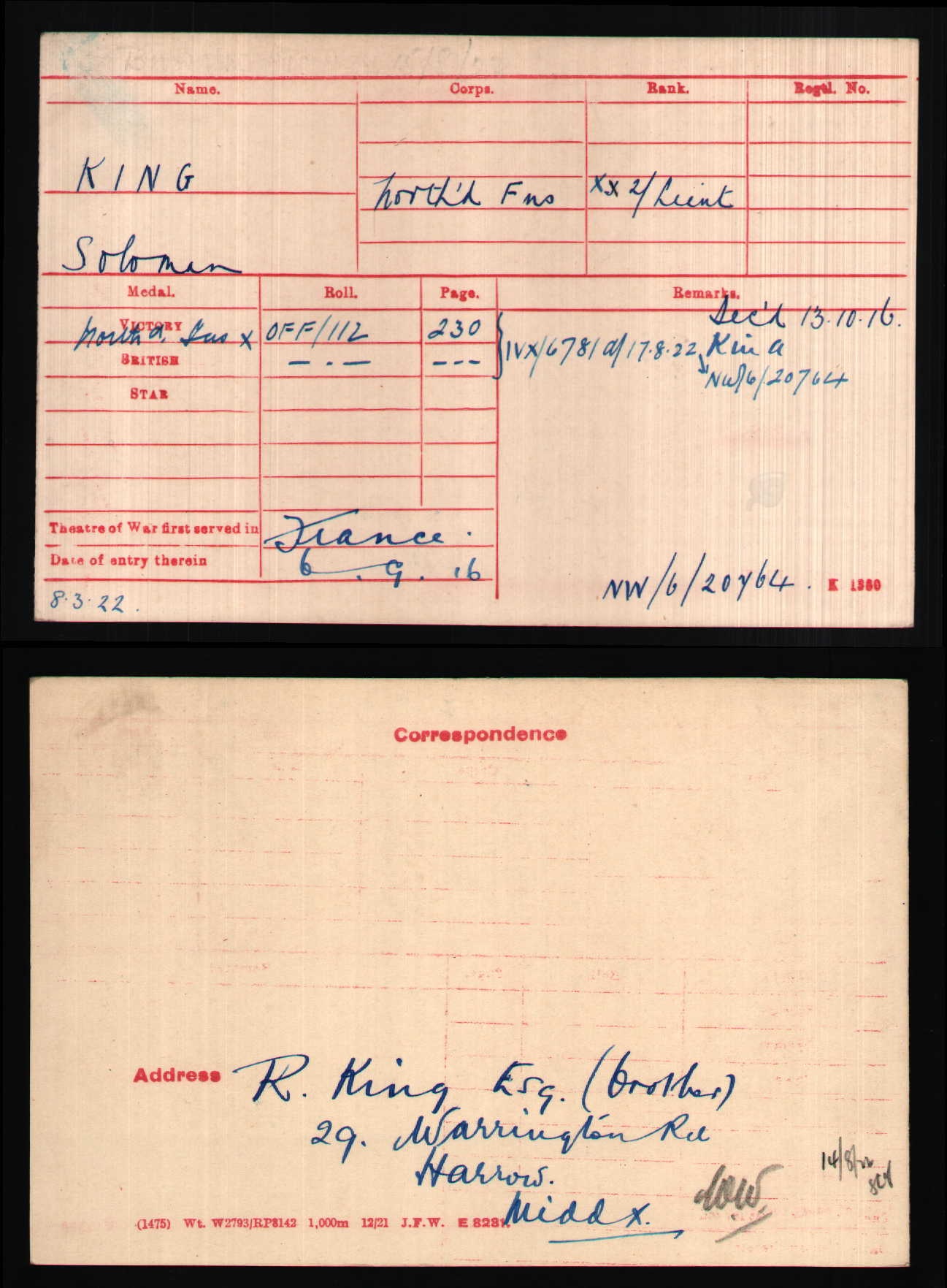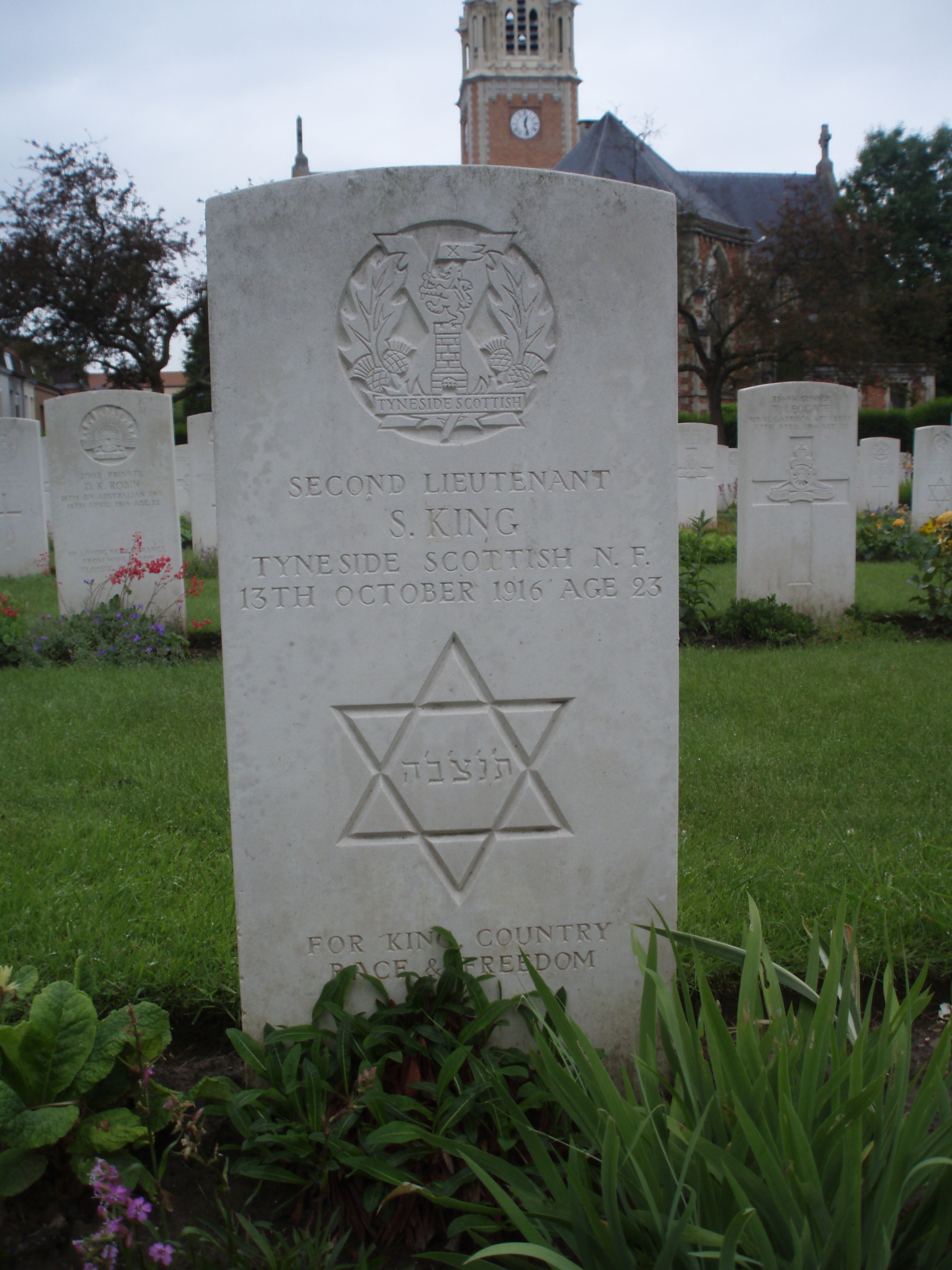 Son of Morris and Jane King. Native of Limerick. ref. South African Roll of Honour 1914-1918. On St. George's College War Memorial, Harare, Zimbabwe. Lieutenant Solly King, born in Ireland, came to Bulawayo in 1902, finished his schooling at St. George's, and was working with the well-known chemists, Lennon's, when war broke out. He not only volunteered, but paid his own passage back to the Old Country. There he joined the Officers' Training Corps and attracted the favourable notice of Colonel Davidson, through whom he received his commission as Lieutenant in the First Northumberland Fusiliers. In the slaughter on the Somme, Lieutenant King was killed on October 12, 1916. His brother, Sergeant Isidore King, also born in Ireland, had come with him at the same time to Rhodesia. Leaving his work with the Bulawayo firm of Charelick Salomon, he enlisted in the Southern Rhodesian Volunteers and then transferred to the British South Africa Police Regiment, with which he went to German East Africa. Seriously wounded up North, he was invalided out of the army, but never fully recovered, and died of the effects in London. His son, Edwin King, became a well-known Cape Town advocate. ***Jewish |