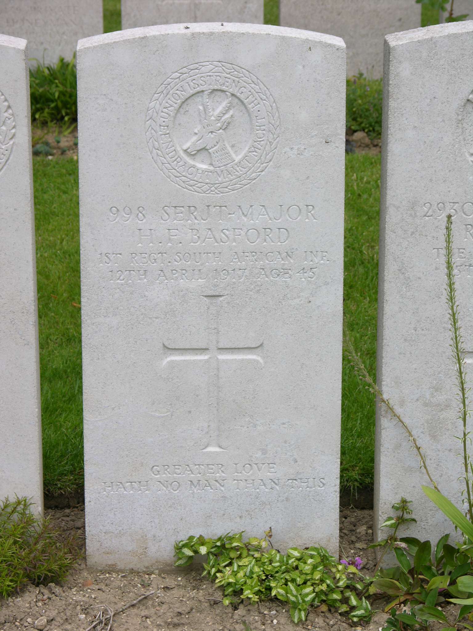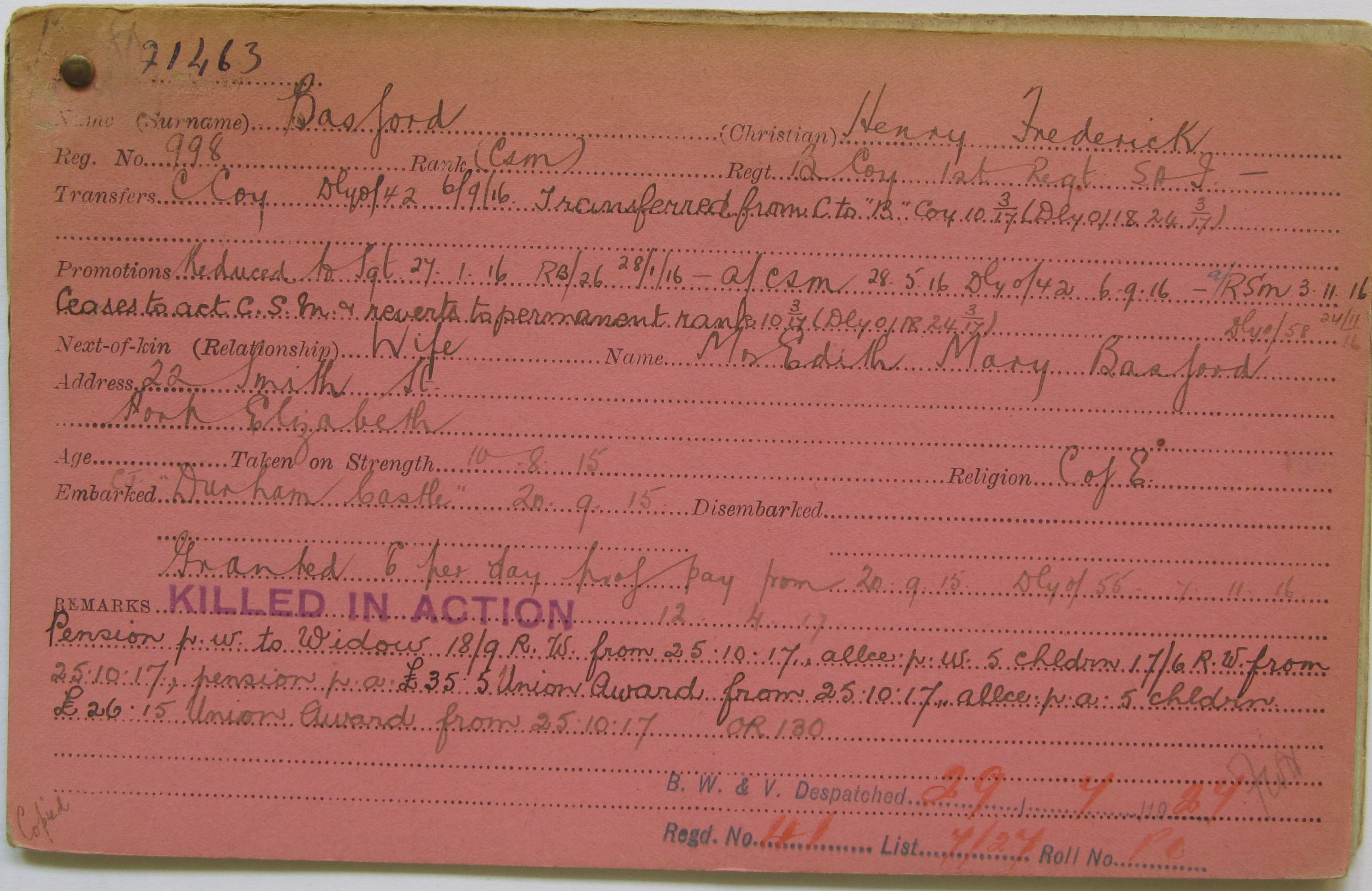 Son of the late John Basford; husband of Edith Mary Basford, of 19 Cuyler Crescent, Port Elizabeth, South Africa. Served in the South African and German South West African Campaigns. Born Leicester, England. Basford was an enthusiastic volunteer and joined the local Regiment, Prince Alfred's Guards in which he held the rank of Company Sergeant Major. He proved to be a smart and popular non-commissioned officer, and fought with the Regiment during the Boer and during the German South West African campaign. Basford was instinctively a soldier to whom family ties, though dear, promptly were superseded when there was a call to arms. Thus, the Great War found him amongst the ardent spirits in the South African Infantry, and though a middle-aged man, he lacked nothing of the energy and efficiency of his younger days. Basford had already survived many hot encounters unscathed, but, as with not a few men in the Great War, held a premonition of impending death.  |