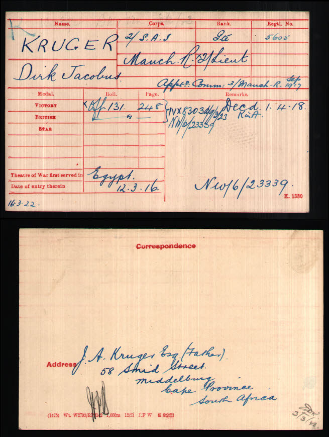 Son of Jan Andries Kruger; stepson of Hester Johanna Maria, of Middelburg, Cape Colony. ref. South African Roll of Honour 1914-1918