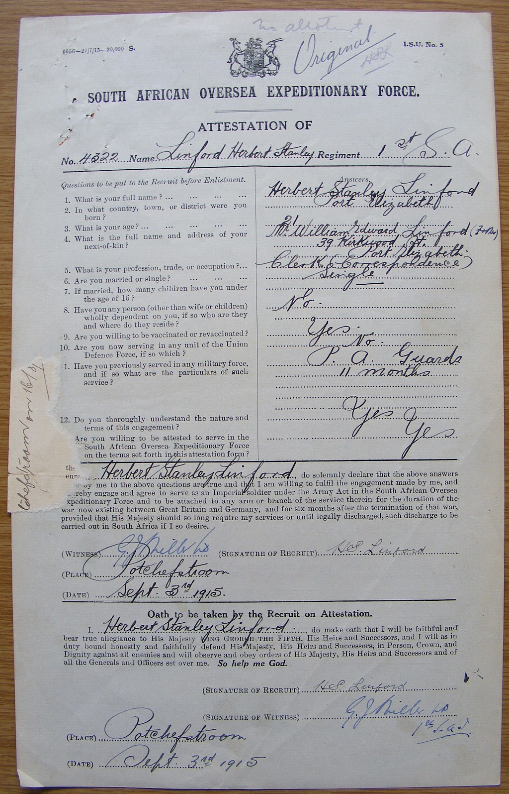 Son of Mr. and Mrs. William E. Linford, of Port Elizabeth. Commemoration stone in Port Elizabeth (North End) Cemetery. His brother also died on service |