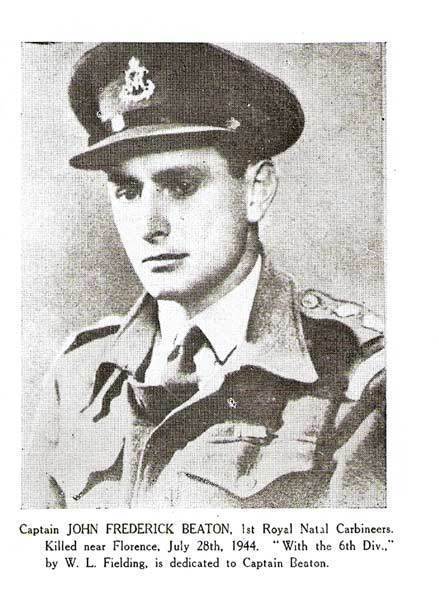 Son of Frederick James Beaton, late of the Kimberley Regiment WW1, and Agnes Margaret Mary Rita Beaton, of Rayman Lodge, Sherborne Road, Parktown, Johannesburg. Educated at Christian Brothers College, Kimberley. He attested in June 1940 and after a period of officer training was sent to North Africa, attached to the SATC. He returned to SA on leave in 1943 and was then sent to Italy. Born in Kimberley, he was an accountant. He was unmarried and had a sister. |