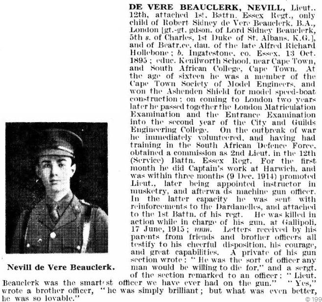 Son of Robert Sidney and Beatrice Annie de Vere Beauclerk. Born Ingatestone, Brentwood, Essex. Educated Kenilworth School near Cape Town and South African College, Cape Town. ref. South African Roll of Honour 1914-1918