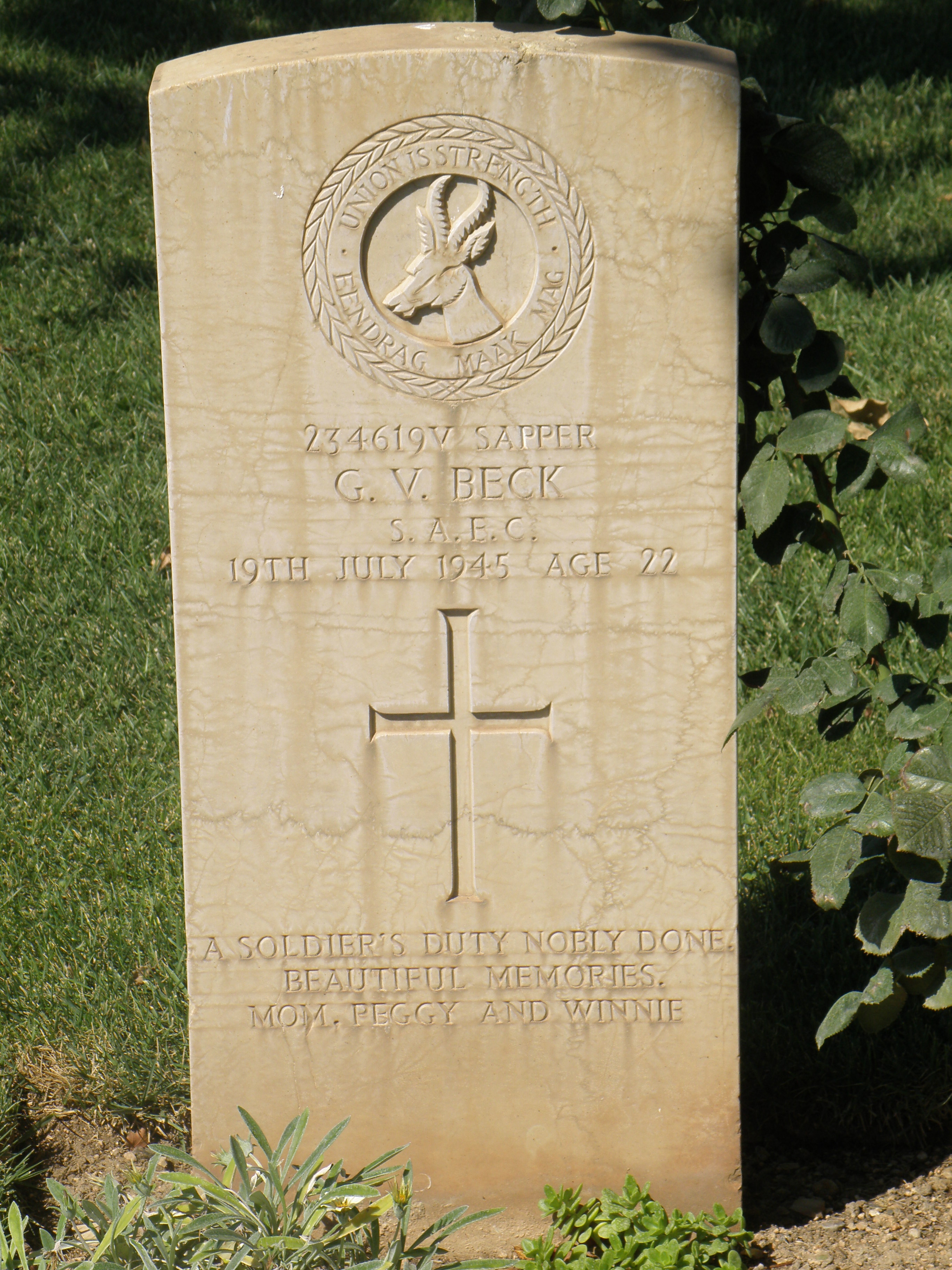 Son of George F. and Mildred Beck, of Krugersdorp, Transvaal, South Africa. Born Standerton, Transvaal. An apprentice boilermaker