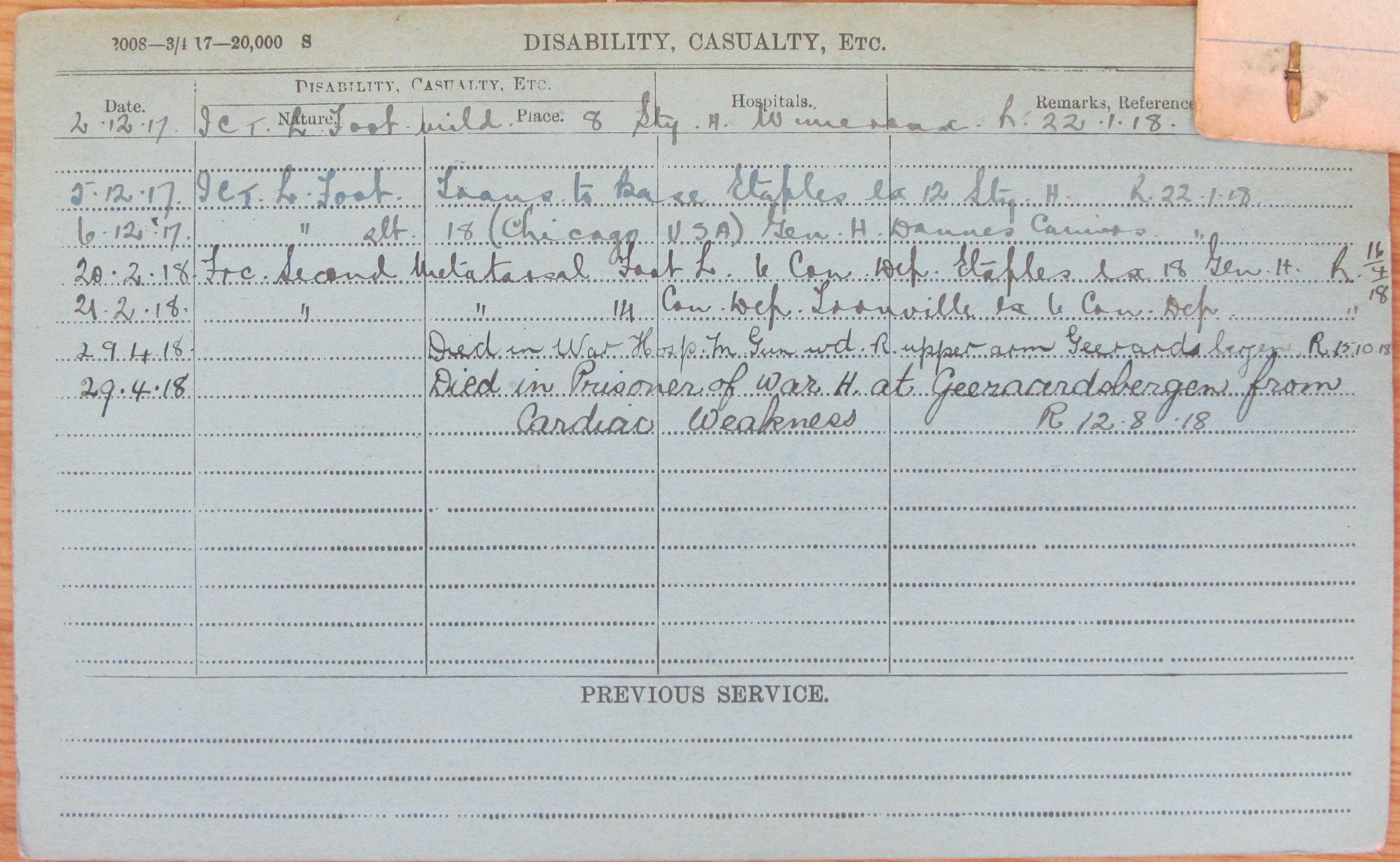 Son of David Keith Mackie and Isabella Craigie Mackie; husband of Helen Keith Telfer (formerly Mackie), of Cape Town, South Africa. Taken prisoner on 13 April 1918. Entered Kriegslazarett 130 in Geraardsbergen on 16 April 1918. Died at 0430 on 29 April 1918. (Bundesarchiv B578_35642 nr. 1938 ). Originally buried at Geraardsbergen communal cemetery German extension grave nr. 43. Reburied at Tournai on 16 December 1927. |