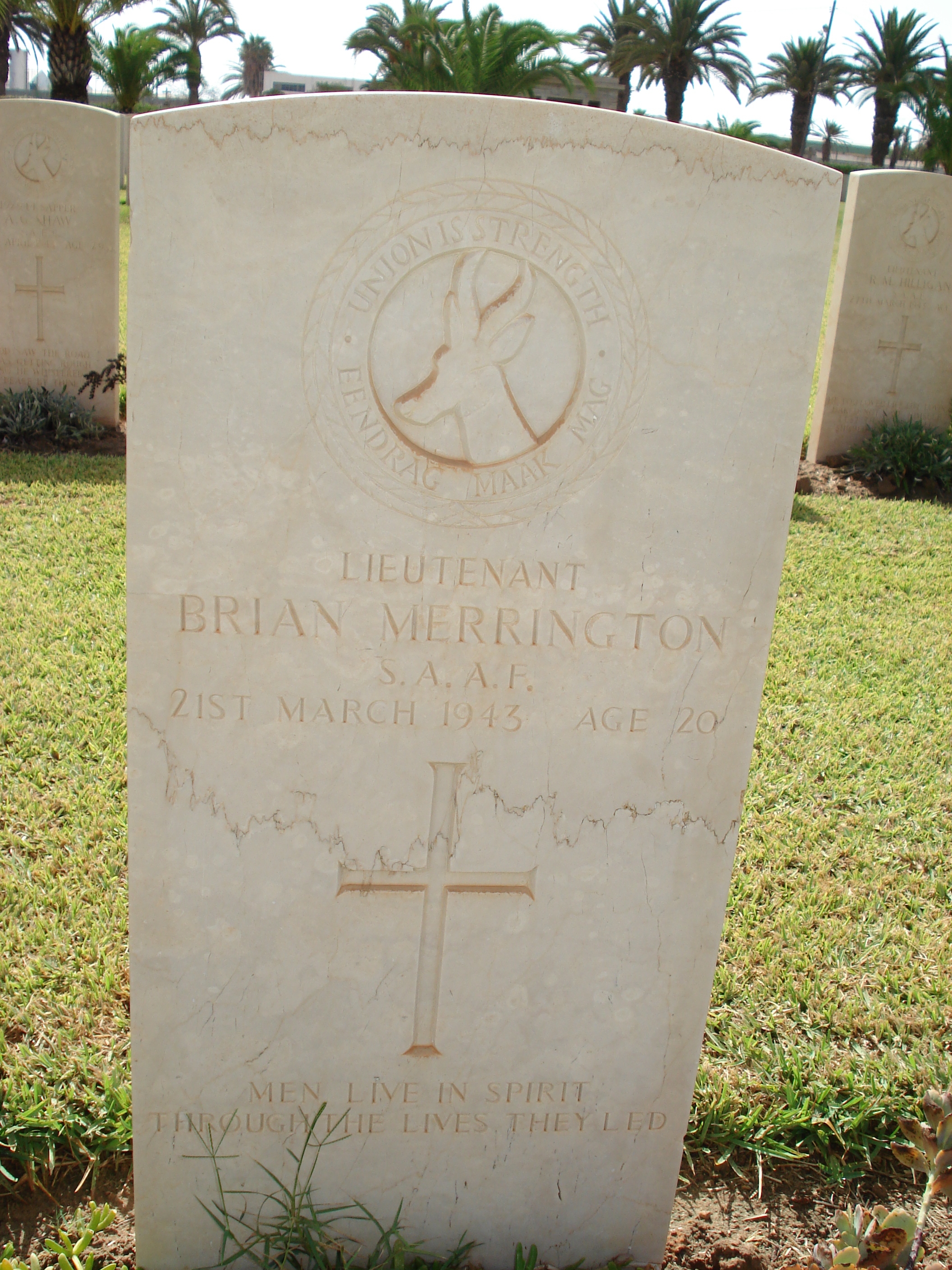 Son of Claude and Martha Merrington, of Darling, Cape Province, South Africa. Educated Paarl Boys High School.1936 ? 1939. A bank clerk in the Strand Standard Bank. Commemorated on Darling Presbyterian Church wall memorial and on the Blockhouse Monument War Memorial, Darling Cemetery