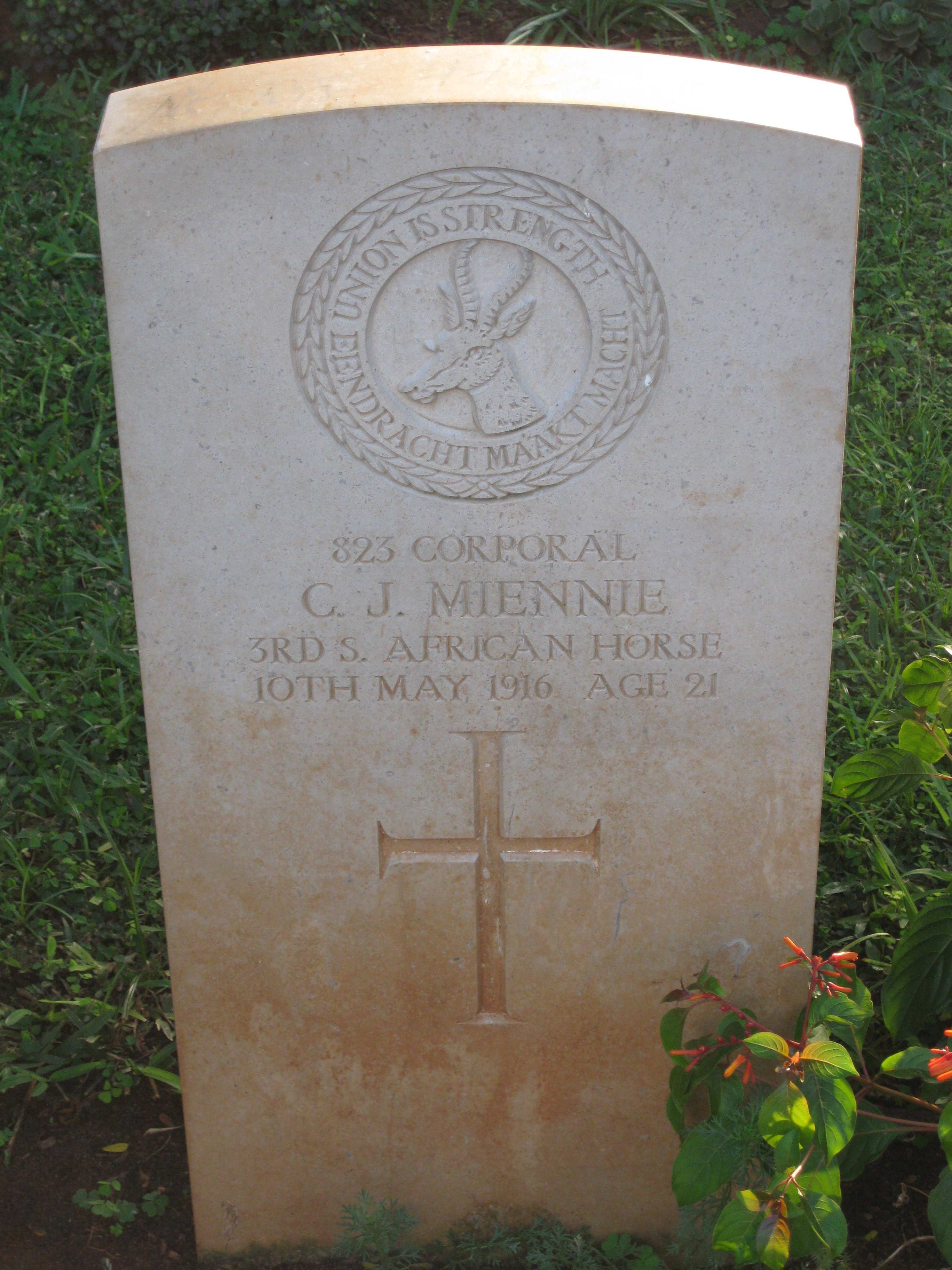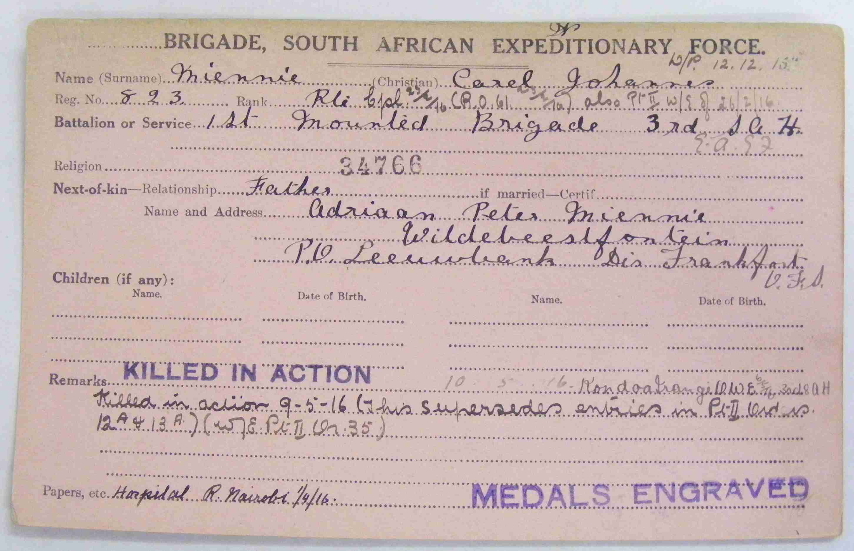 Son of Mr. Adriaan Pieter and Cornelia Dorothea Miennie (nee Steyn), of Vruggebrink, Frankfort, Orange Free State, South Africa. Born District Heilbron. A land owner.