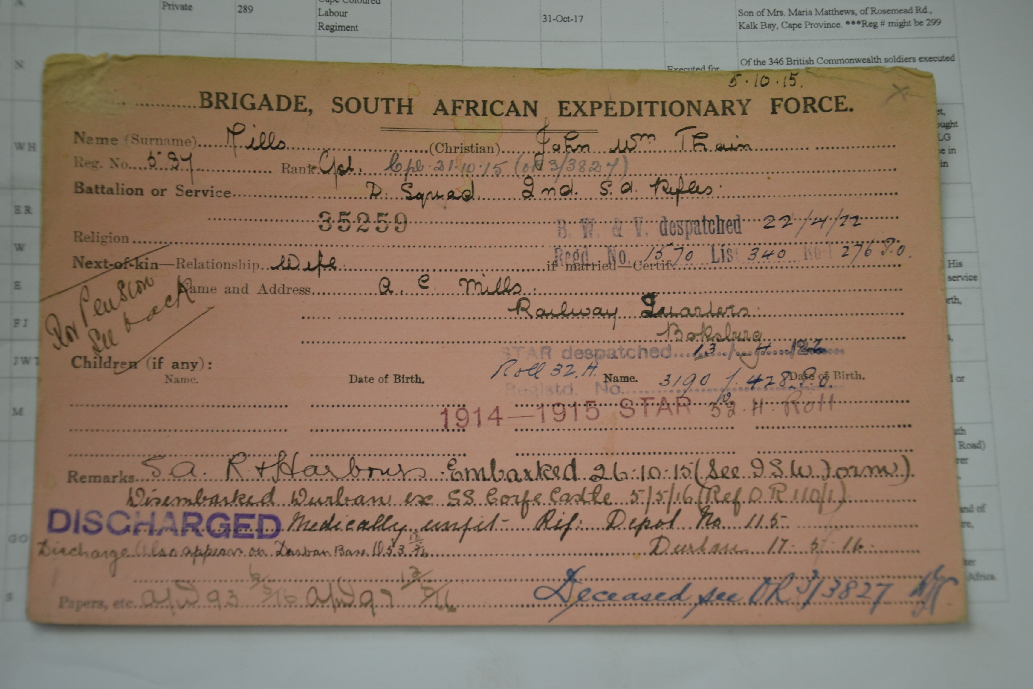 Son of John William and Jessie Mills, of Dundee. Husband of Anna Christina Wilhelmina Mills, of Railway Quarters, Boksburg. Born Hong Kong. A railway checker |