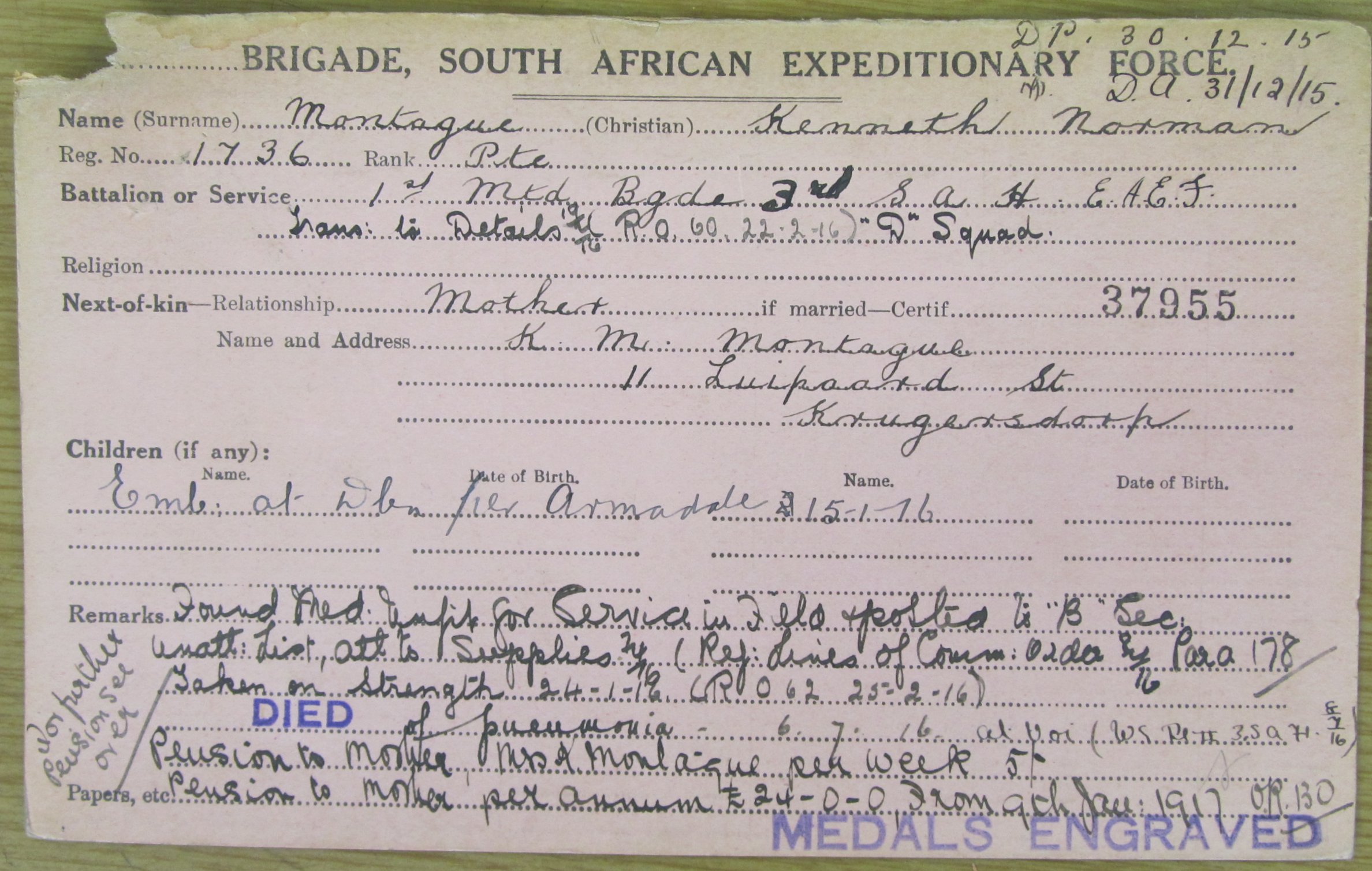 Son of Frederick William Earle Norman and Kate Mary Montague, of 7, Luipaard St., Krugersdorp, Transvaal. Born Krugersdorp. A miner.