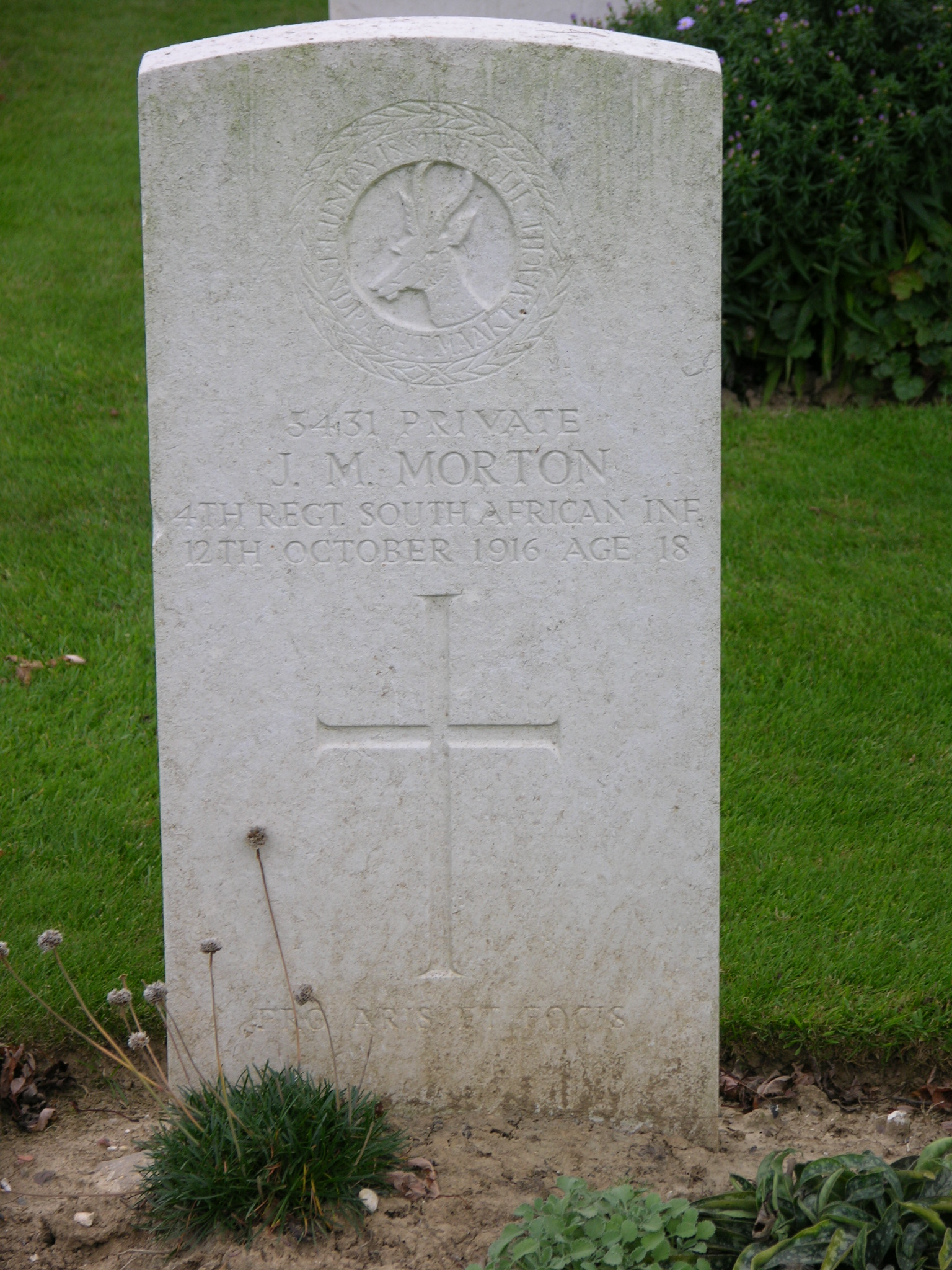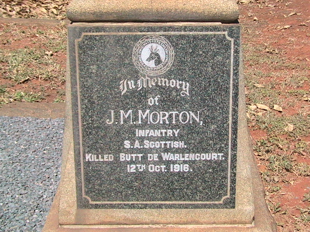 Son of William Scott Morton and Jane Scott Morton, of 93, River St., Sunnyside, Pretoria, South Africa. Native of Pietermaritzburg, Natal. His brother also died on service. On Maritzburg College cenotaph. Commemoration stone in Pretoria (Rebecca Street) Cemetery