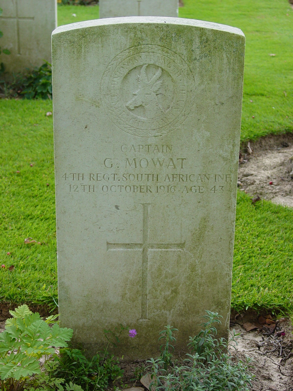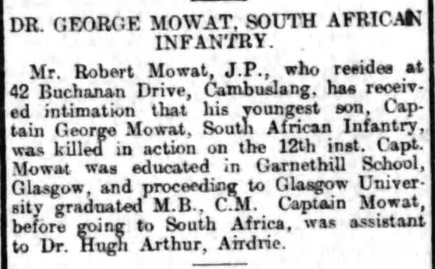 Son of Robert and Elisabeth Irvine Mowat (nee Hunter), of Glasgow, Scotland. Attended University of Glasgow. From The Scotsman 21 October 1916 - Captain George Mowat, South African Contingent, was a son of Robert Mowat, JP, 42 Buchanan Drive, Cambuslang. He was educated at Garnethill School, Glasgow, and graduated MB, CH at Glasgow University. On the outbreak of the Boer War he was accepted for and was twice mentioned in dispatches. At the conclusion of the war, he returned to Cambuslang, and later settled in Johannesburg as a medical practitioner. On the outbreak of the present war he volunteered for combatant service, and took part in the campaign in German South-West Africa. He was afterwards gazette Captain. He was 43 and unmarried. |