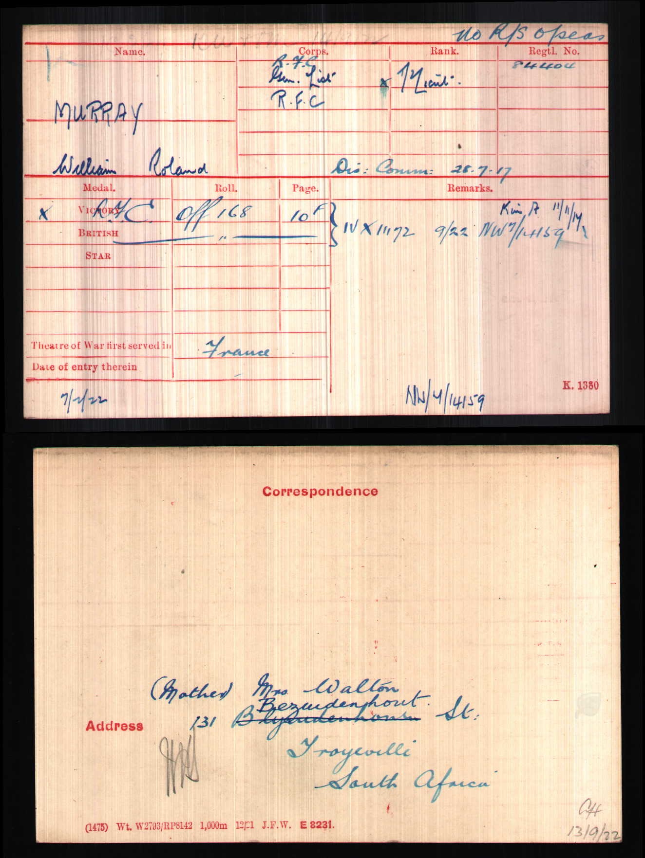 Son of Mrs. L. R. Walton, of Kensington, Johannesburg. On Bezuidenhout Valley War Memorial. ref. South African Roll of Honour 1914-1918 |