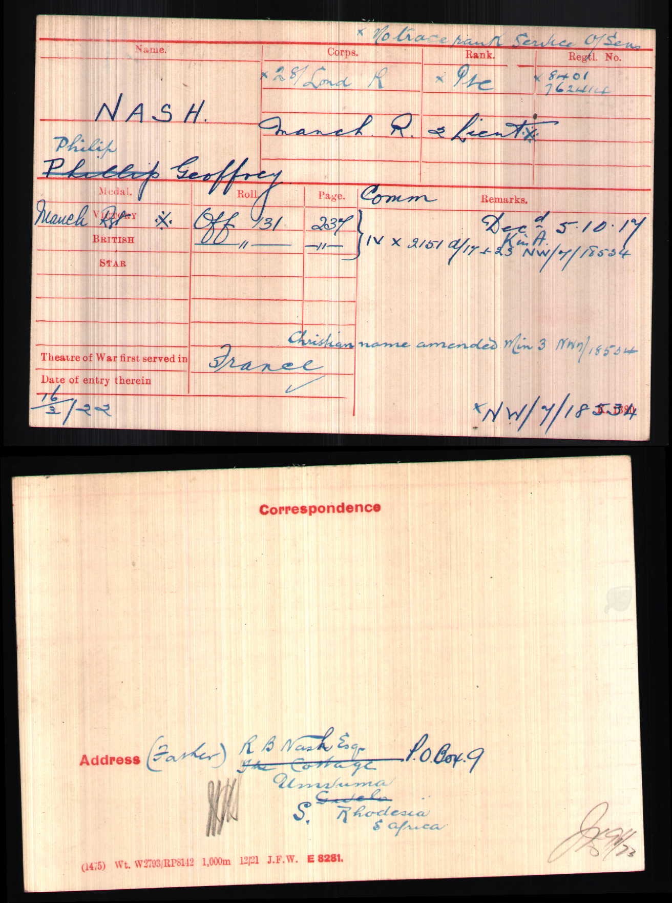 Son of Mr. R. B. Nash, of Umtata, Southern Rhodesia. On St. George's College War Memorial, Harare, Zimbabwe. ref. South African Roll of Honour 1914-1918.