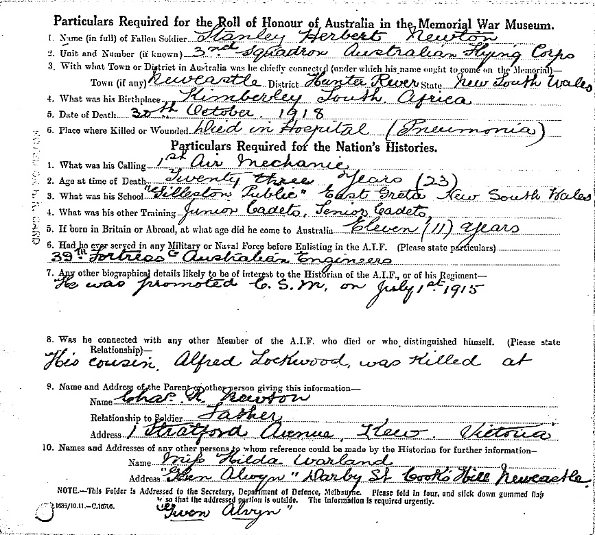 Son of Charles Rembrandt Newton and Hester Magdalene Newton, of 1, Stratford Avenue, Kew, Victoria, Australia. Native of Kimberley, South Africa.