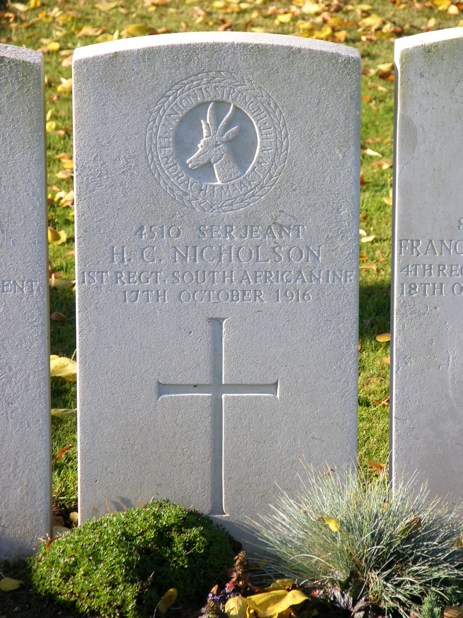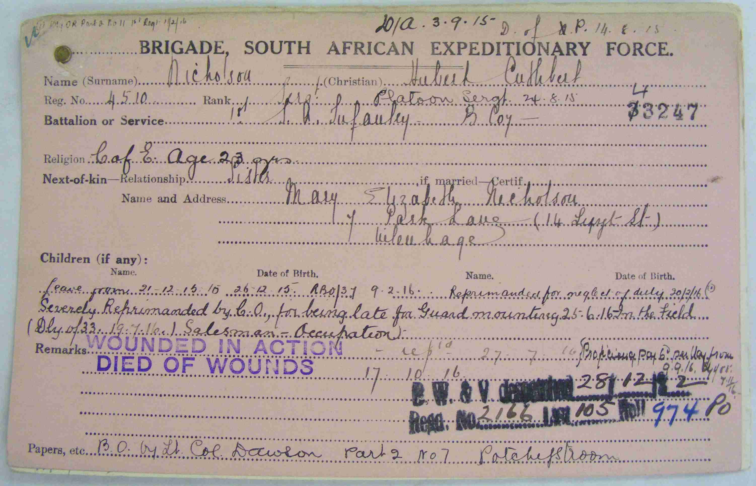 Brother of Mary Elizabeth Nicholson, of Uitenhage. Wounded in Delville Wood on the 16th July 1916. |