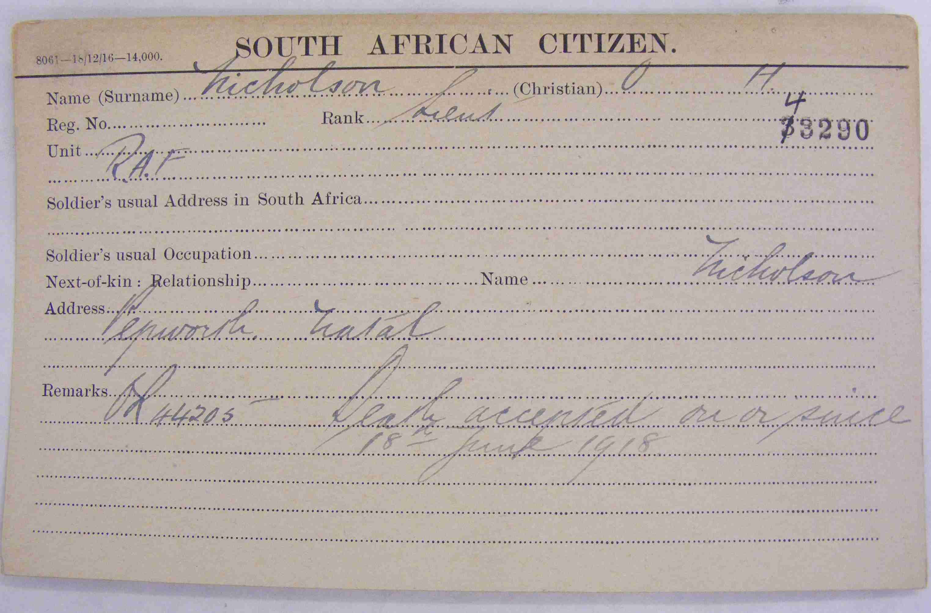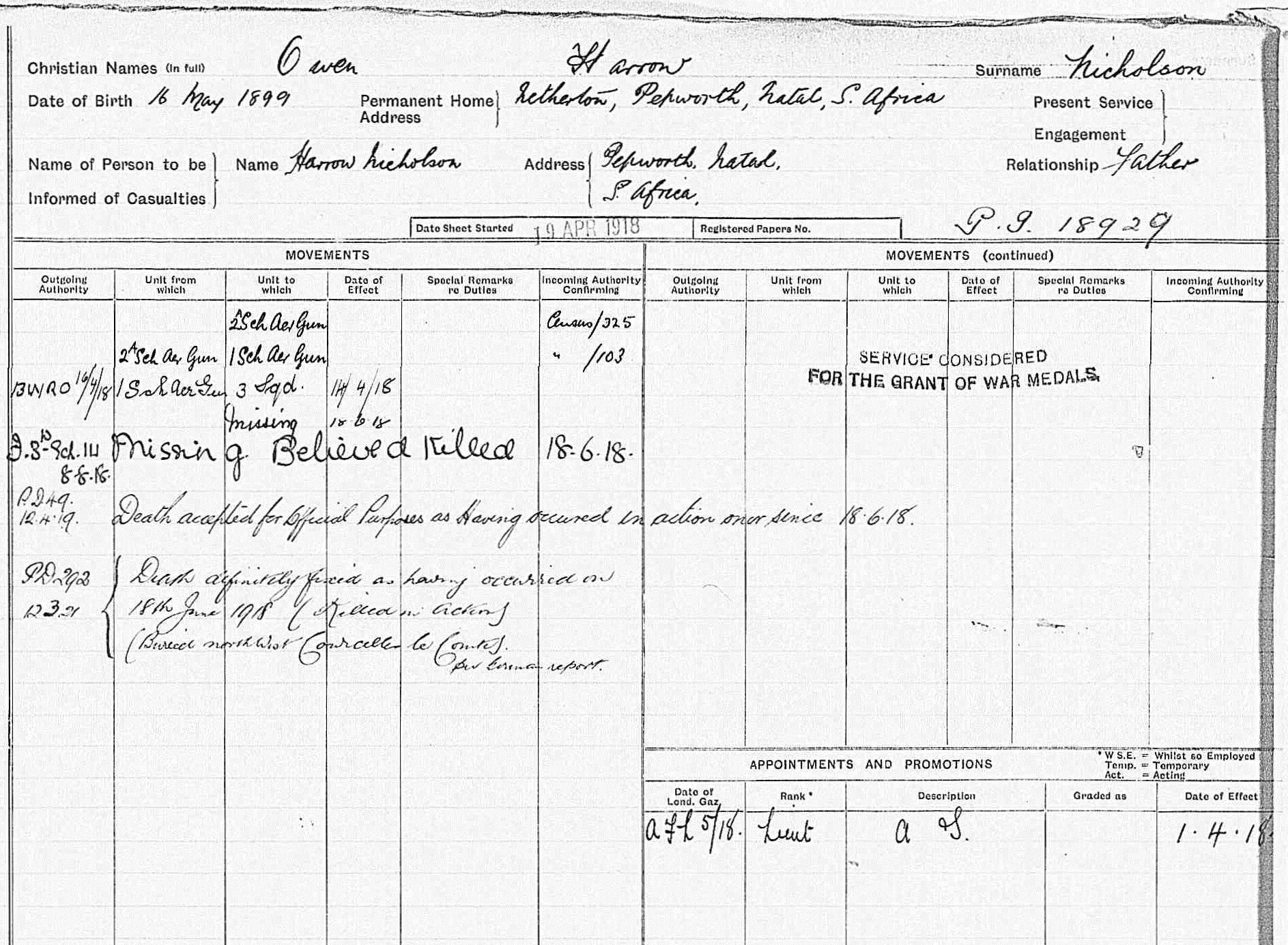 Son of Harrow and Beatrice Rose Nicholson, of Netherton, Pepworth, Natal, South Africa. Educated at Hilton College, Natal. ***Buried north west of Courcelles-Le-Comtes