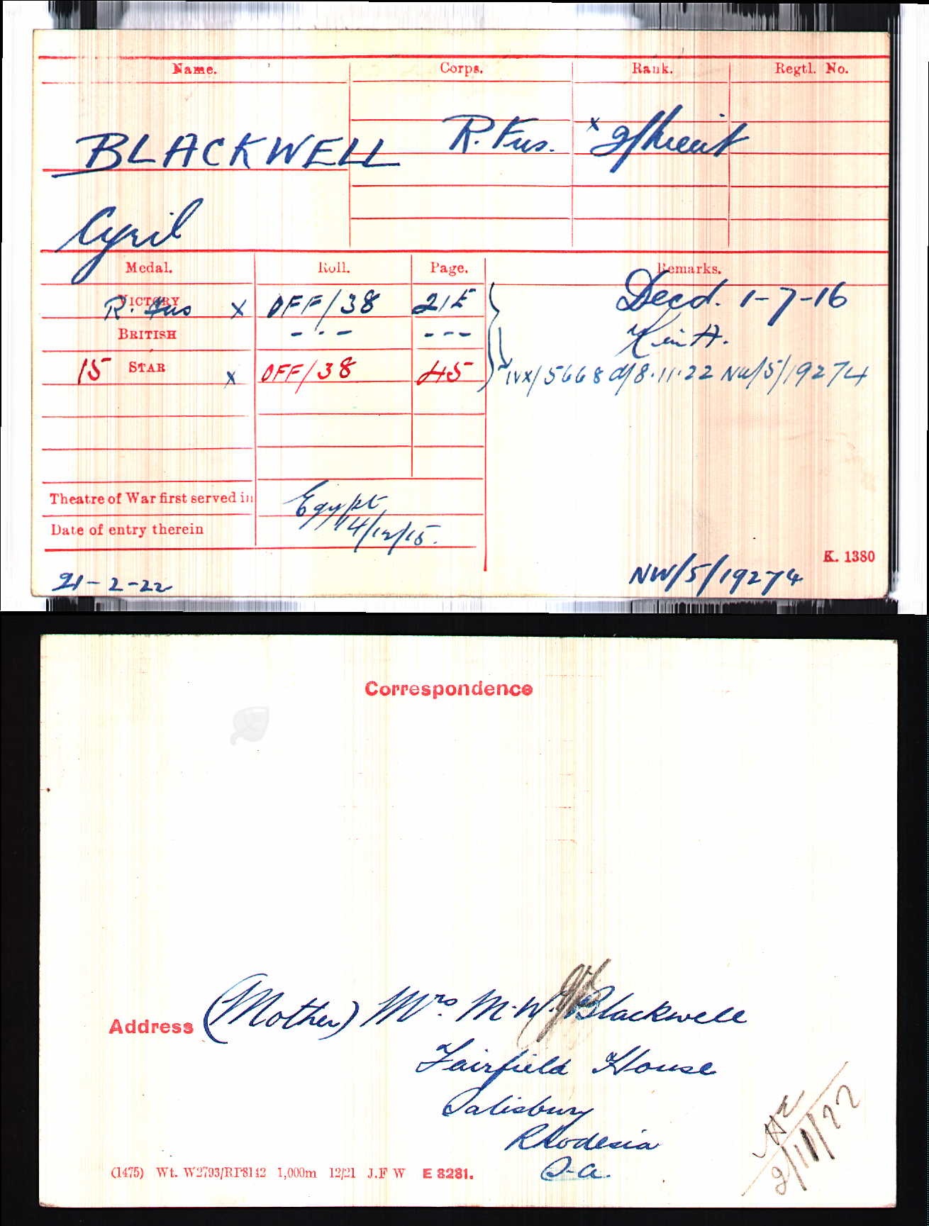 Son of Marion Whelan Blackwell, of Fairfield House, North Avenue, Salisbury, Rhodesia, and the late John Blackwell (B. & N.W. Railways, Bengal, India).