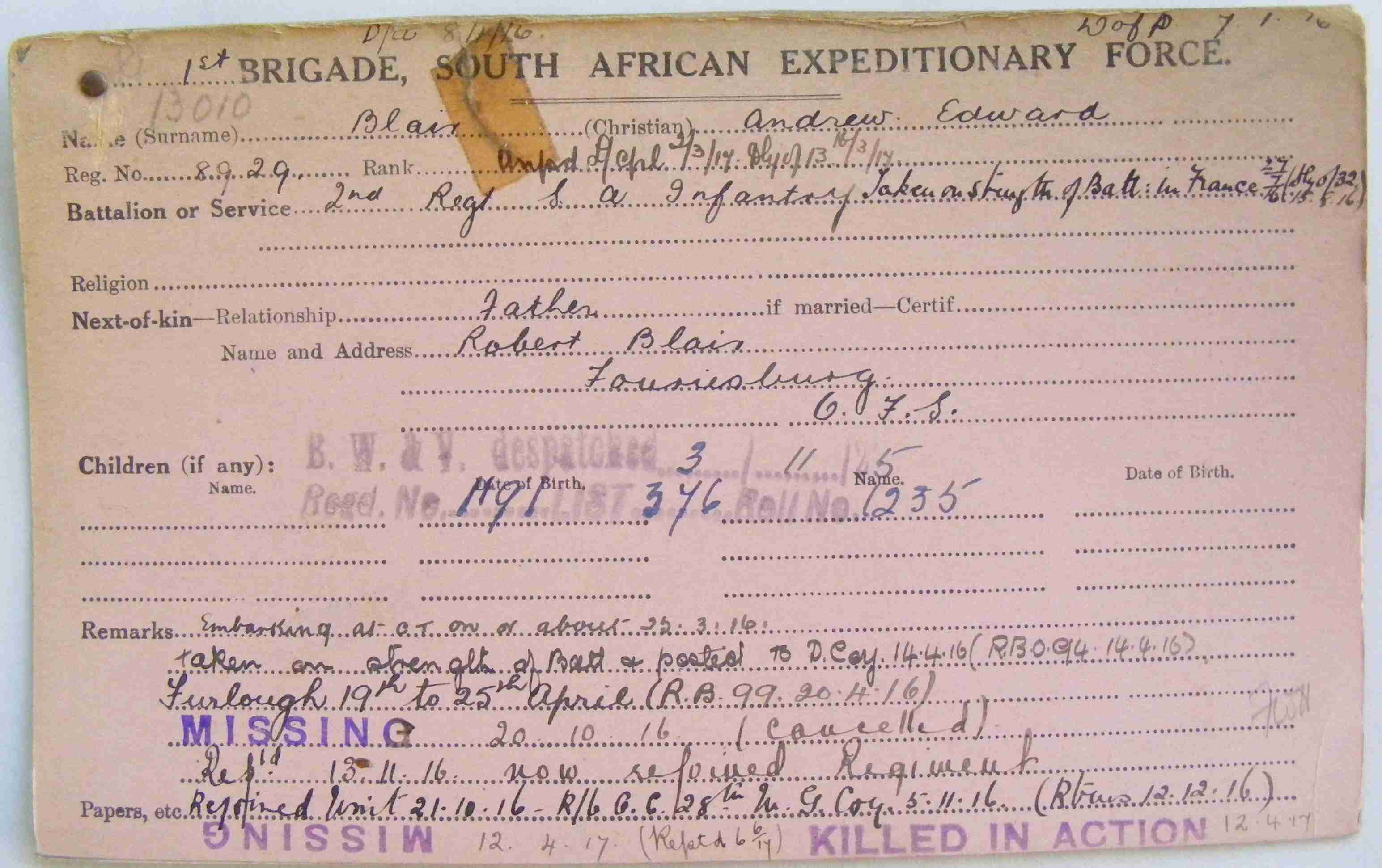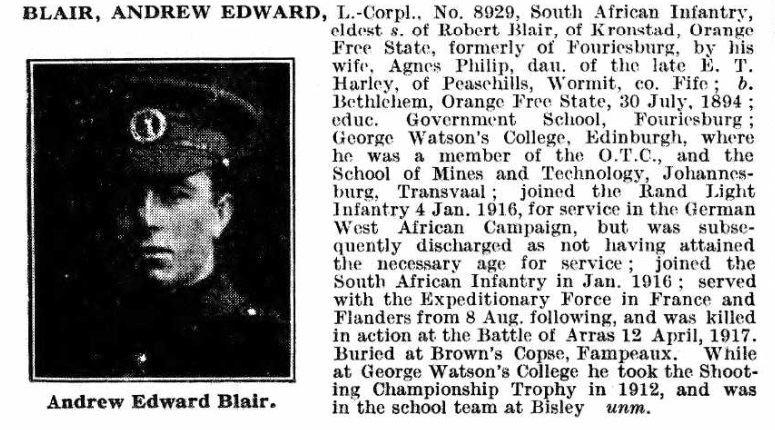 Son of Robert and Agnes Blair, of 43a, Brand St., Kroonstad, Orange Free State. Born Fouriesburg, Orange Free State. A student. Proceeding to Scotland, he entered George Watson's College in 1906. He won the Shooting Championship 1912, and returned to South Africa that year, and entered the School of Mines and Technology, Johannesburg, intending to qualify as a mining engineer. In 1914 he was mobilised with the Rand Rifles. He was released and returned to the School of Mines. In Jan. 1916 he enlisted for service.  |