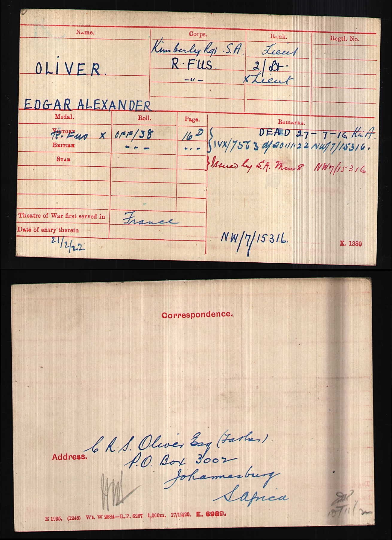 Son of Mr. H. A. Oliver, C.M.G., of Kimberley. Commemoration stone in Johannesburg (Braamfontein) Cemetery. ref. South African Roll of Honour 1914-1918