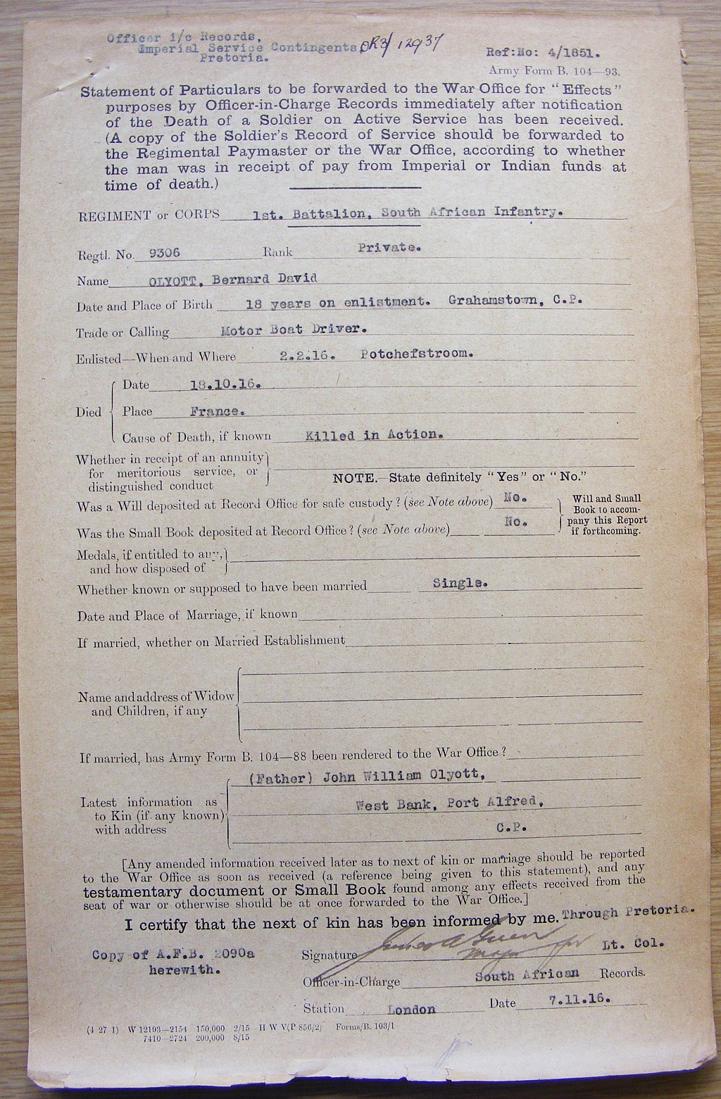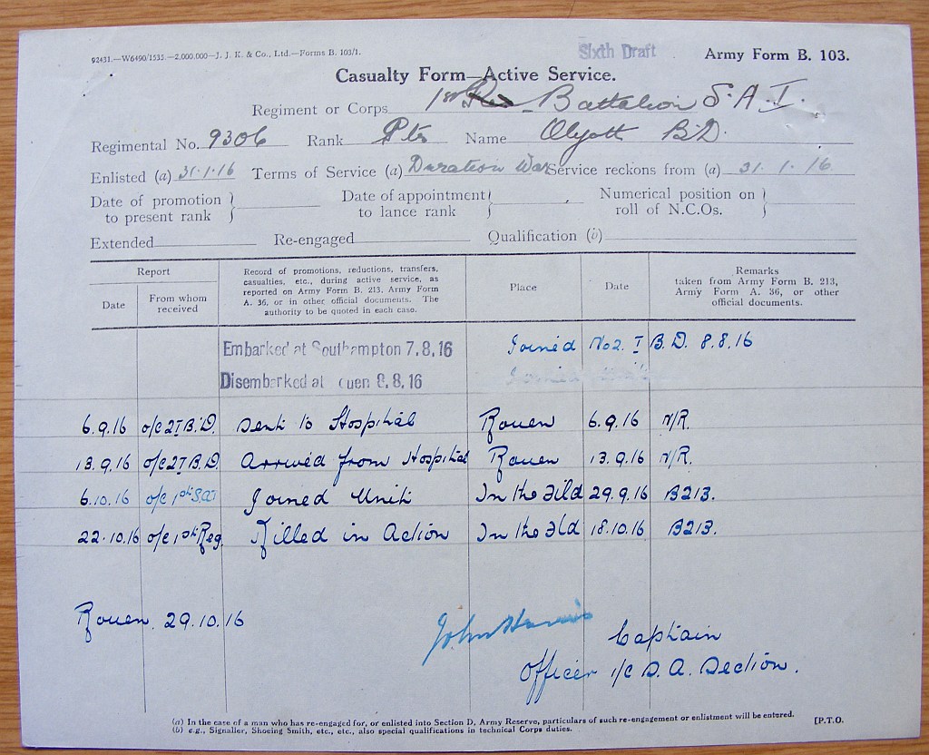 Killed in action. On the 18th October 1916, at 3.40 am, three companies of the 1st S.A.I. attacked Snag and Tail Trenches. The B Coy failed to realize that they had reached Snag Trench and continued beyond it. They had lost touch with their flanks and only some men succeeded to come back. Only a block was established at 50 metres of The Pimple. The D Company launched an attack at 5.45 pm and Snag Trench was occupied but the machine-gun fire from the Butte de Warlencourt took a heavy toll, leaving a small group in the trench. |