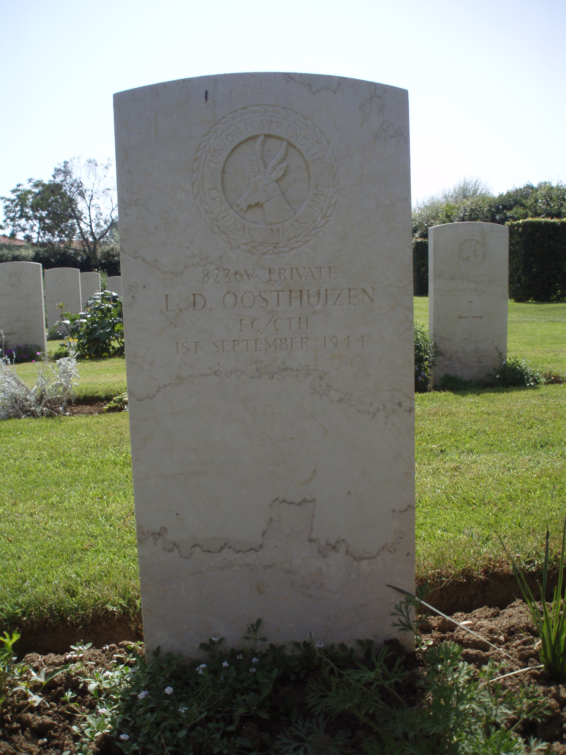 Died of wounds, at 11:40 a.m. Oosthuizen with his Lieutenant and another soldier was sent to investigate the anti-personnel mines that had been placed by the South Africans themselves. The patrol accidentally detonated one and he was wounded. The Lieutenant was killed instantly. The event took place at the Medici Villa dell'Ambrogiana near the Arno river, which was then the seat of a psychiatric hospital |
