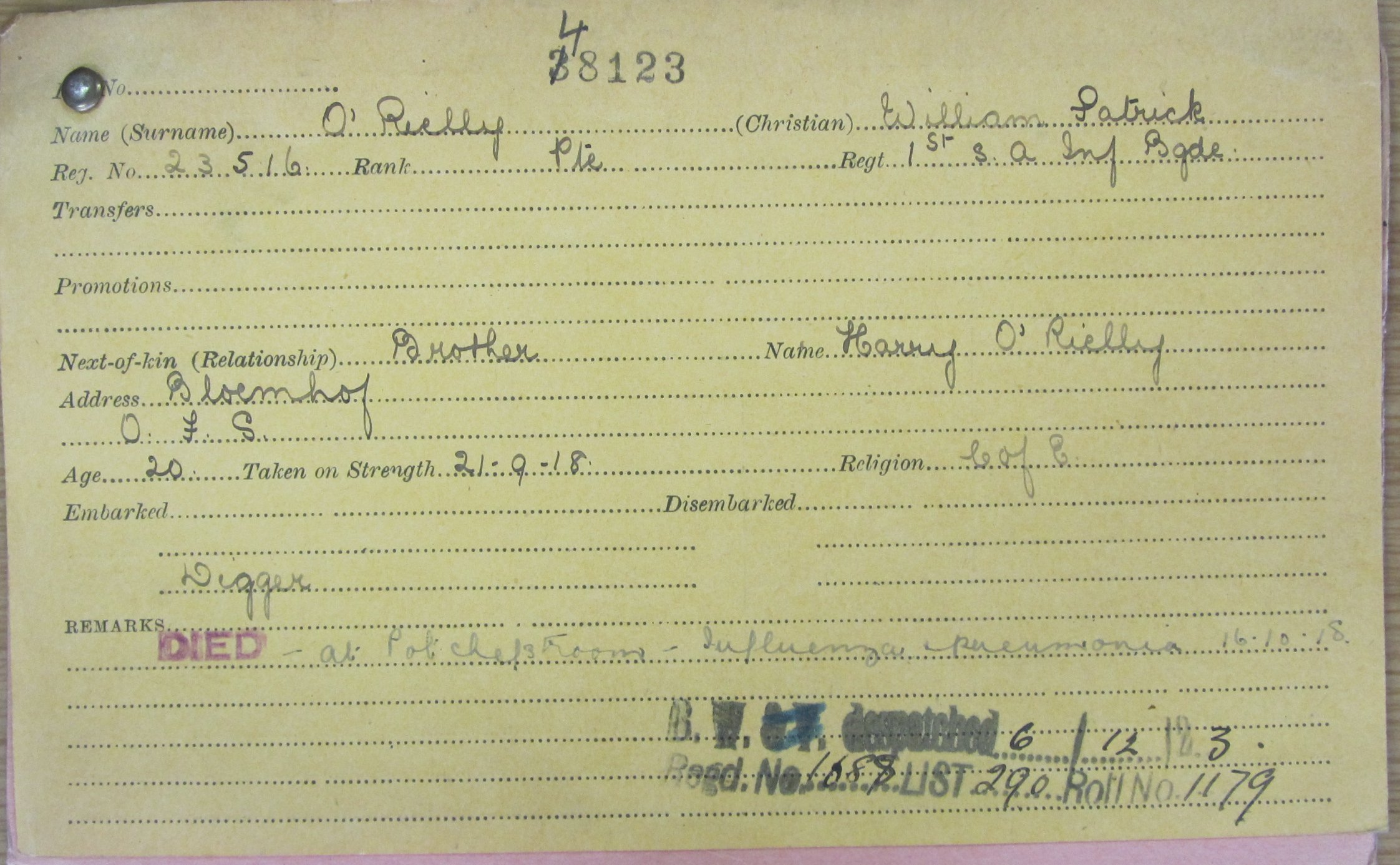 Brother of Harry O'Reilly, of Bloemhof, Orange Free State |
