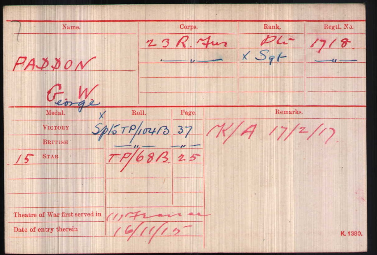 Son of George William and Mary Ann Paddon, of 223, Jules St., Jeppes Extension, Johannesburg, South Africa. Born Standerton