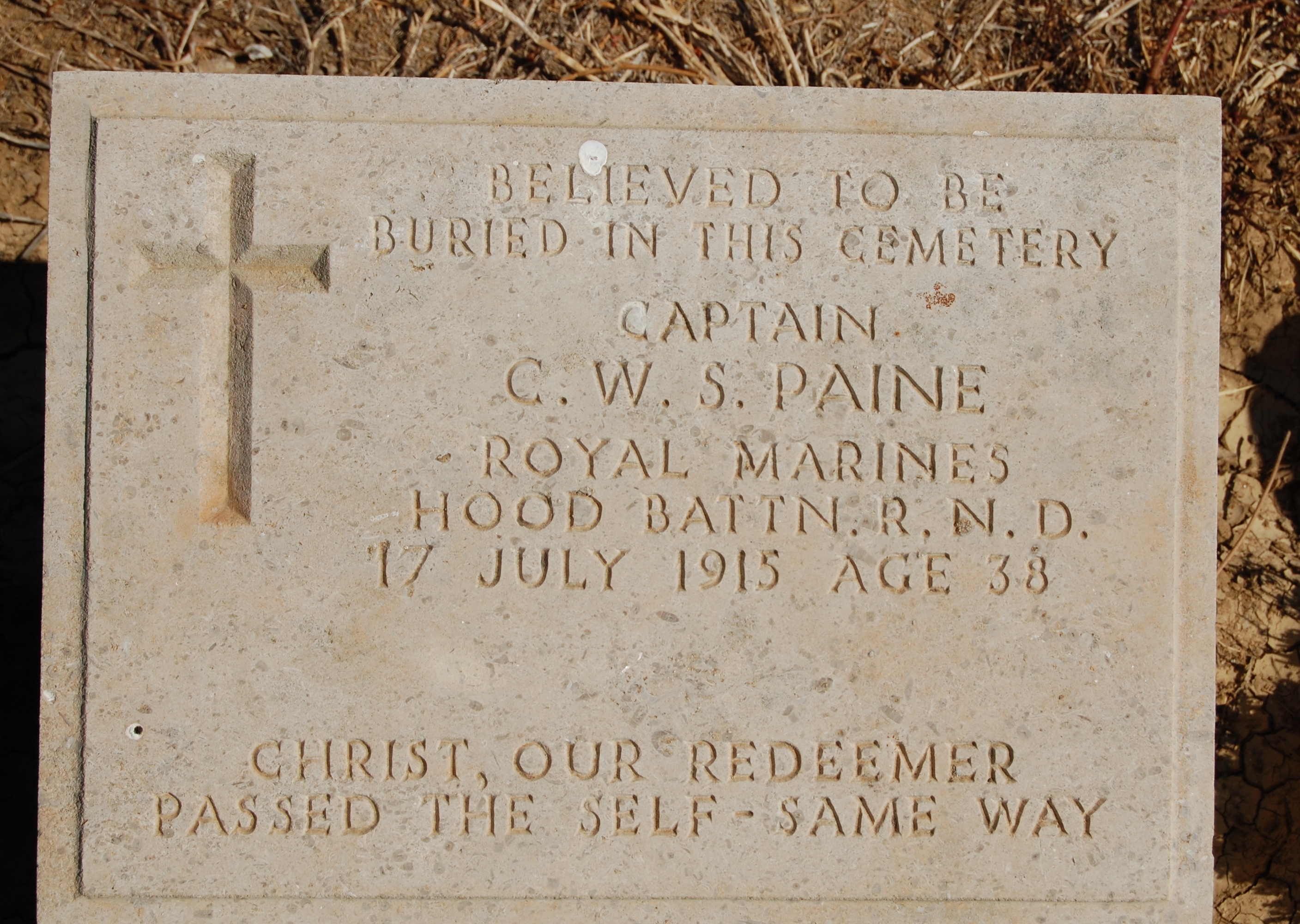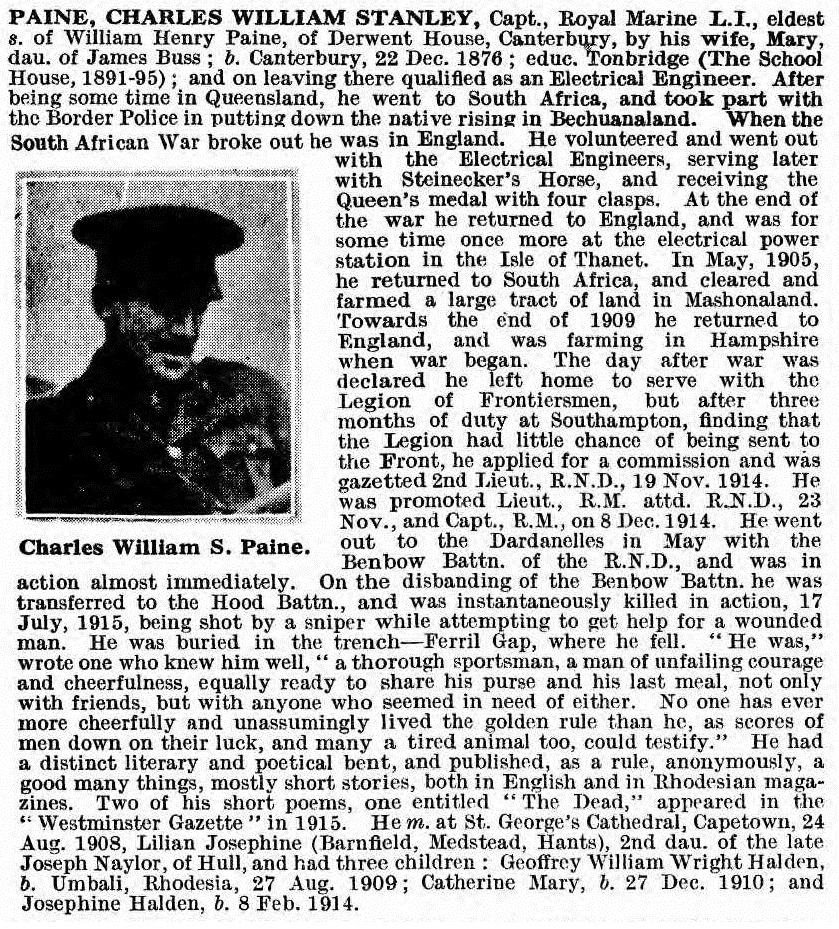 Son of the late William Henry Paine, of Canterbury, and Mary, his wife; husband of Lilian Josephine Paine, of Bamfield, Medstead, Hants. Served in the South African War. Born December 22nd 1876, in Canterbury, Kent, the eldest son of William Henry and Mary (nee Buss) Paine, of Derwent House, Canterbury. Husband of Lilian Josephine (nee Naylor) Paine (married August 24th 1908, at St. George's Cathedral in Cape Town, South Africa), of Barnfield, Medstead, Hampshire. Father of Geoffrey William Wright Halden (born August 27th 1909, in Umtali, Rhodesia), Catherine Mary (born December 27th 1910), and Josephine Halden (born February 8th 1914). He was educated at Tonbridge School in Kent (1891-1895), and upon leaving qualified as an electrical engineer. He went to Queensland, Australia, and later to South Africa, where he served with the Border Police against the uprising in Bechuanaland. On the outbreak of the Boer War in 1899 he was in England, and enlisted in the Electrical Engineers, later transferring to Steinbecker's Horse (Queen's South Africa Medal with 4 clasps). After the war he returned to England, where he was employed as an electrical engineer at the power station on the Isle of Thanet. In May 1905 he returned to South Africa to take up farming in Mashonaland. In 1909 he returned to England with his wife and son, and on the outbreak of war in August 1914 he was farming in Hampshire. On August 5th 1914, he left his farm to enlist in the Legion of Frontiersmen, but in November 1914, he applied for a commission in the RMLI, as the Legion's chances of serving at the front were slim. |
