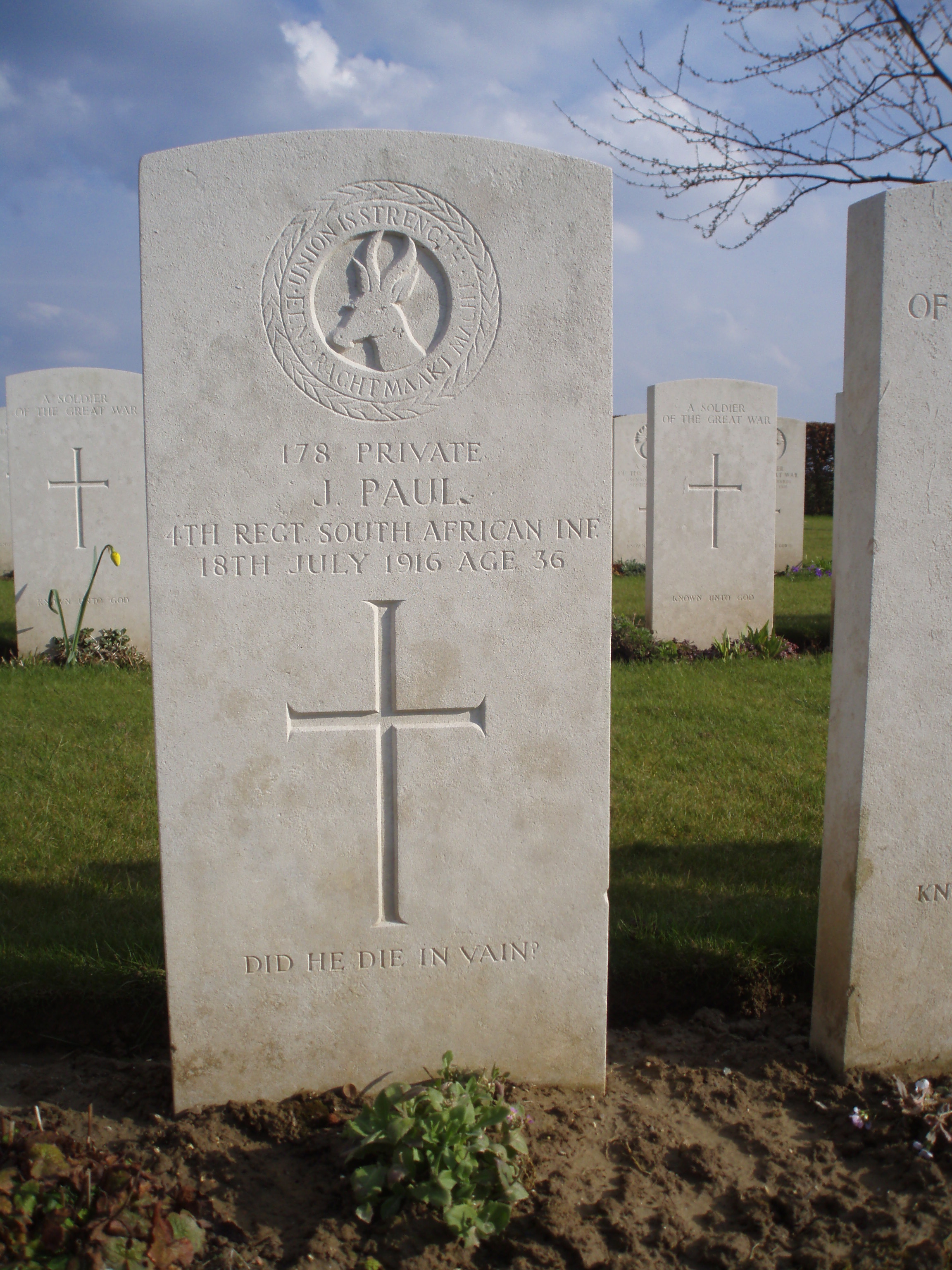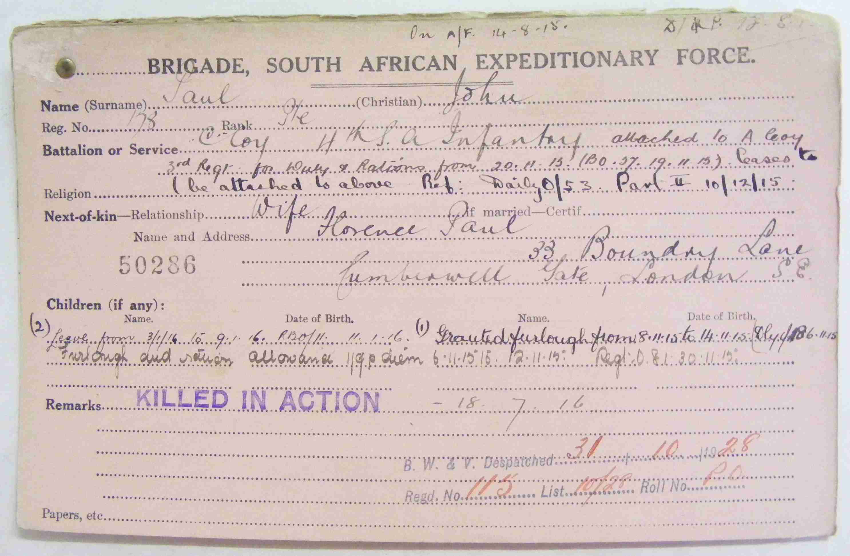 Son of Robert and Agnes Paul, of Broughty Ferry, Angus; husband of Florence Paul, of 33, Boundary Lane, Walworth, London.
