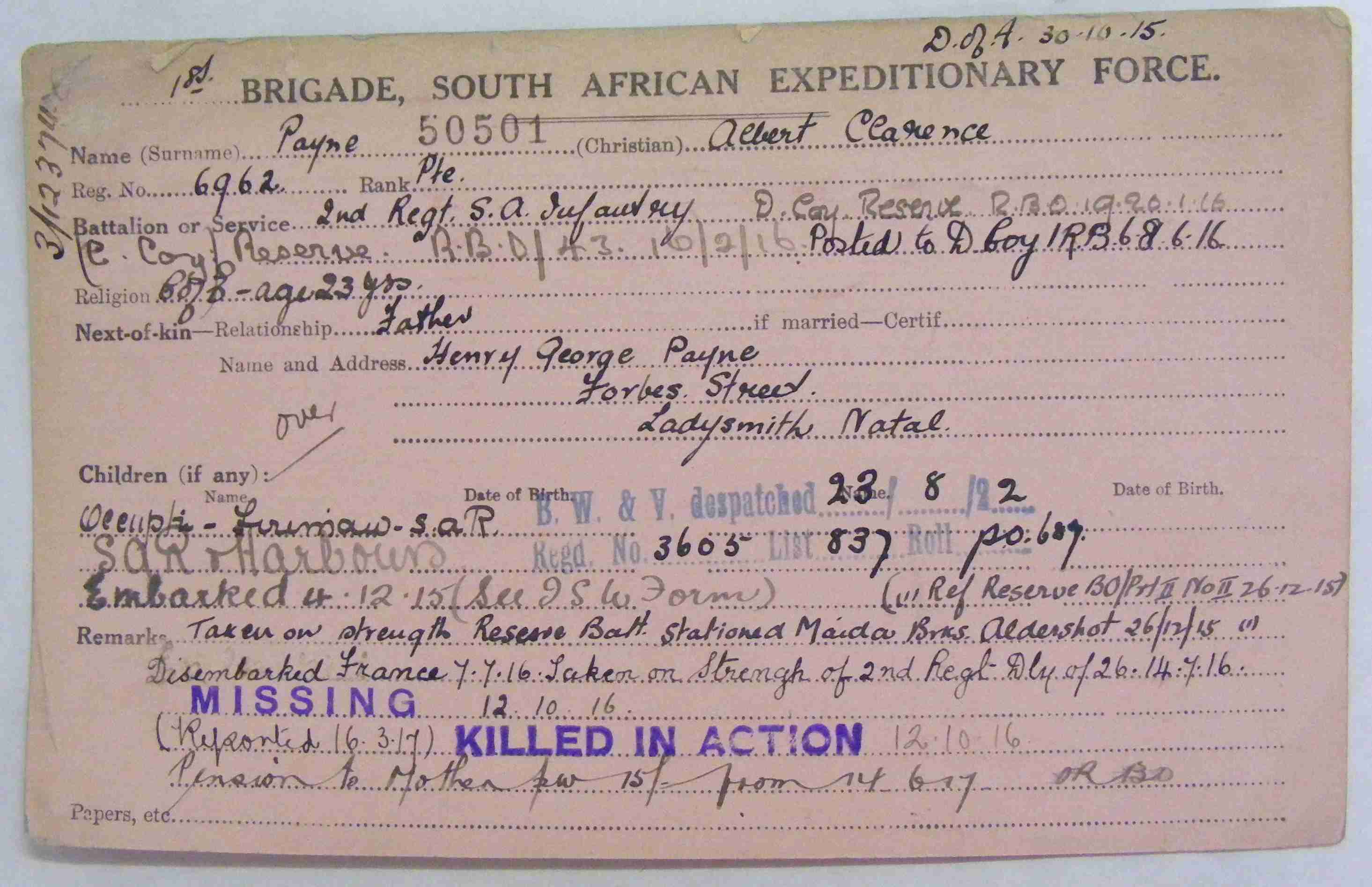 Son of Mr. Henry George Payne, of Ladysmith, Natal and Mrs. Amy Payrle, of 23, Lennox Rd., Durban. Fought in Delville Wood in July 1916. |