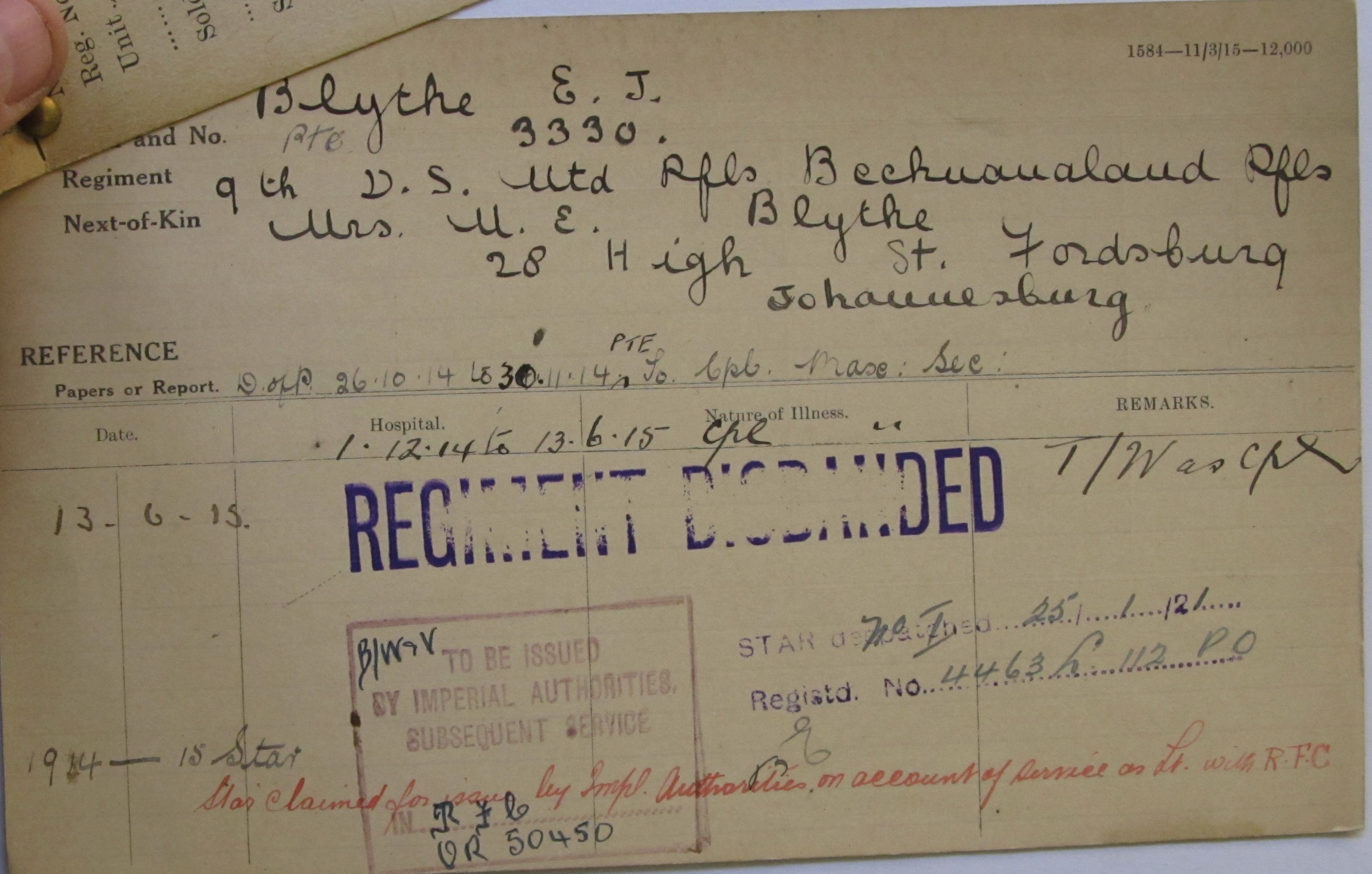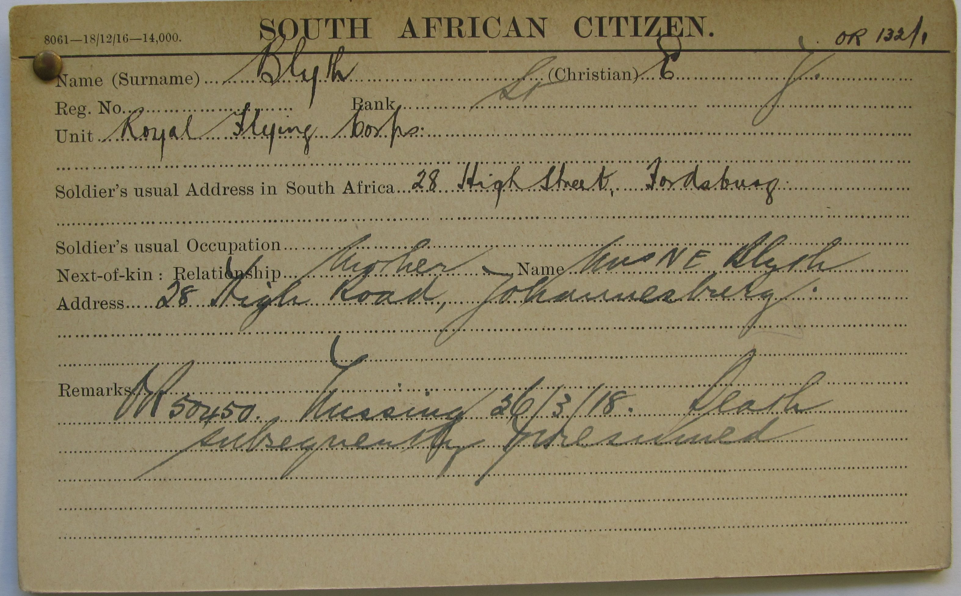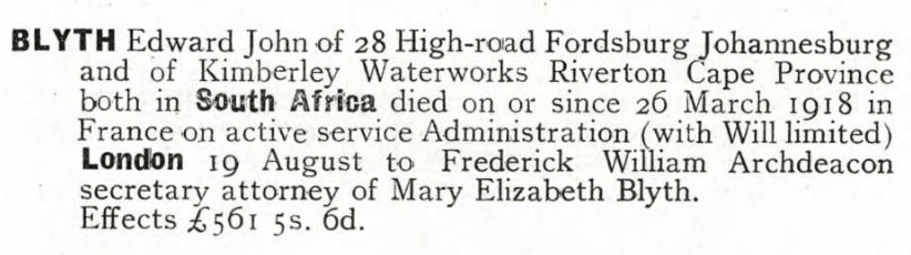 Son of Mary Elizabeth Blyth, of 28 High Road, Fordsburg, Johannesburg. On war memorial for King Edward VII School, Johannesburg. His brother Wilfred Ernest Hill Blyth also died in service