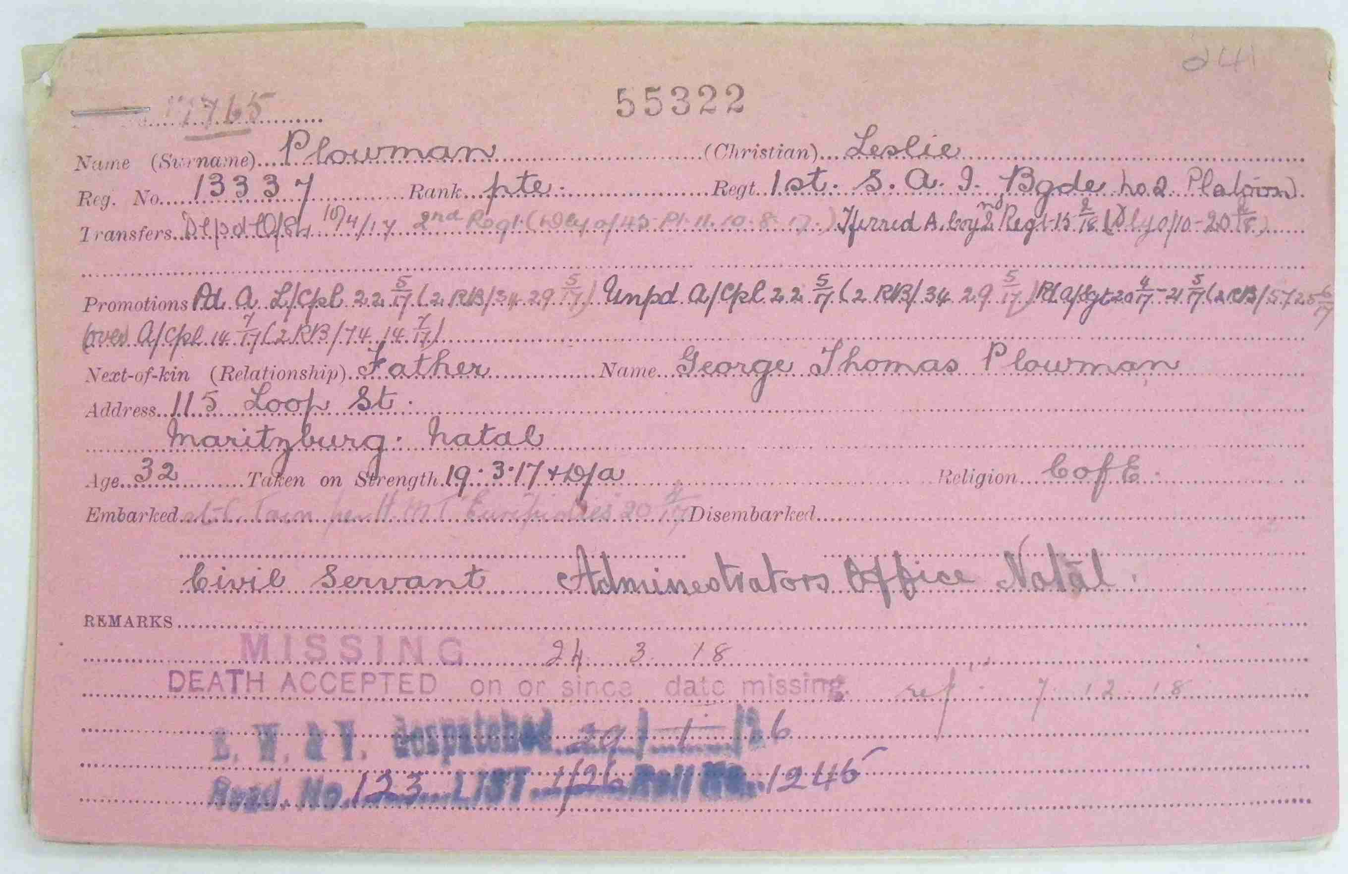 Son of Sir George Thomas and Lady Harriott Ann Plowman, of Pietermaritzburg, Natal. On Maritzburg College cenotaph. |