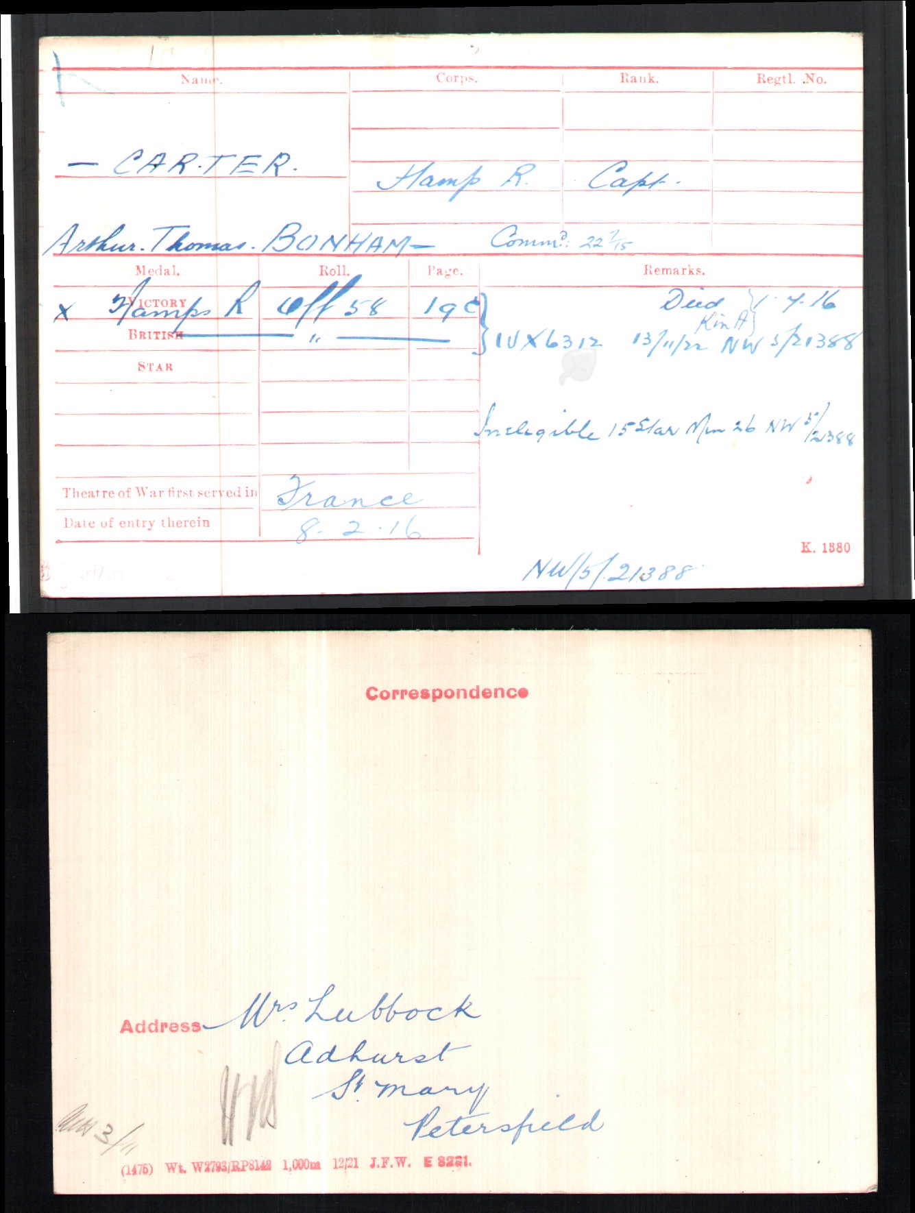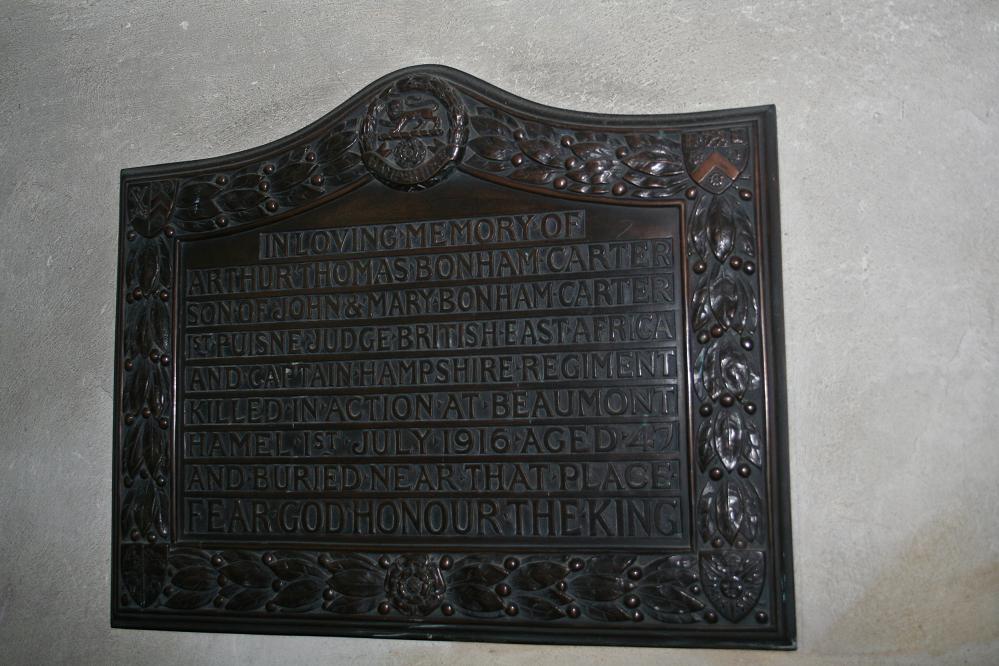 The third son of John Bonham-Carter M.P. J.P. D.L. (Fellow of Winchester College, 1873-1884), of Adhurst St. Mary, Petersfield, and of Laura Bonham-Carter. She died in 1859 and his father remarried the Hon Mary Baring, daughter of Lord Northbrook, becoming his second wife. He entered Mr. Bramston's House from St George's Preparatory School in Ascot. He shot for Wimbledon VIII in 1887. The same year he went up to Trinity College, Cambridge, taking his degree in 1890. In 1894 he was called to the Bar by the Inner Temple and joined the Western Circuit. On the outbreak of the South African War of 1899-1902 he offered his services and obtained a commission in the 1st Volunteer Company of the Hampshire Regiment. From 1902 to 1914 he held various judicial appointments in the Transvaal and British East Africa, and when the European War broke out he was First Puisne Judge of the High Court at Mombasa. He immediately undertook the organization of the Mombasa Town Guard and served for several months with the Defence Force as Director of Military Supplies. He returned to England and joined the 3rd Battalion (Special Reserve) and was posted to the 1st Battalion Hampshire Regiment. His British Army Medal Roll Index Card indicates that he went to France on February 8th 1916 and it was as Company Commander near Beaumont Hamel that he was killed on the first day of the Battle of the Somme, July 1st 1916. ref. South African Roll of Honour 1914-1918 |