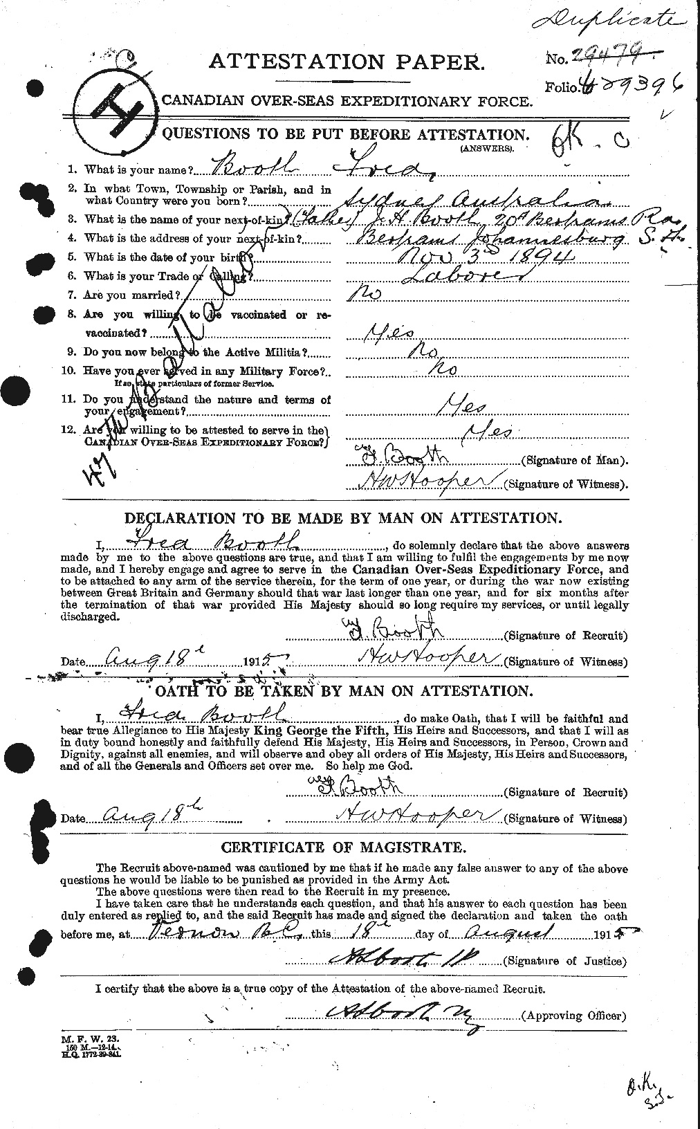 Son of Sarah Booth, of 36A, Bertram Rd., Bertrams, Johannesburg, Transvaal, South Africa, and the late James Henry Booth. Nicknamed in his company "General".