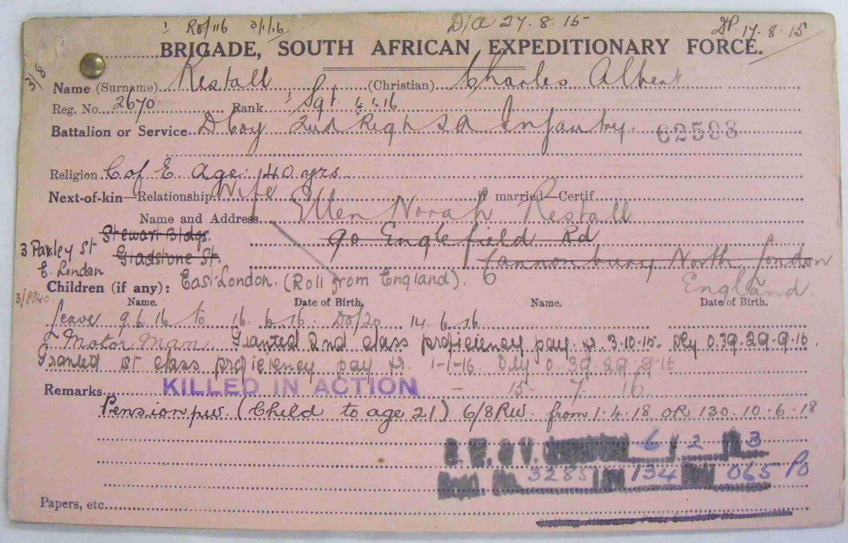 Husband of Ellen Norah Restall, of 43, St. Peter's Rd., East London, Cape Province, South Africa.