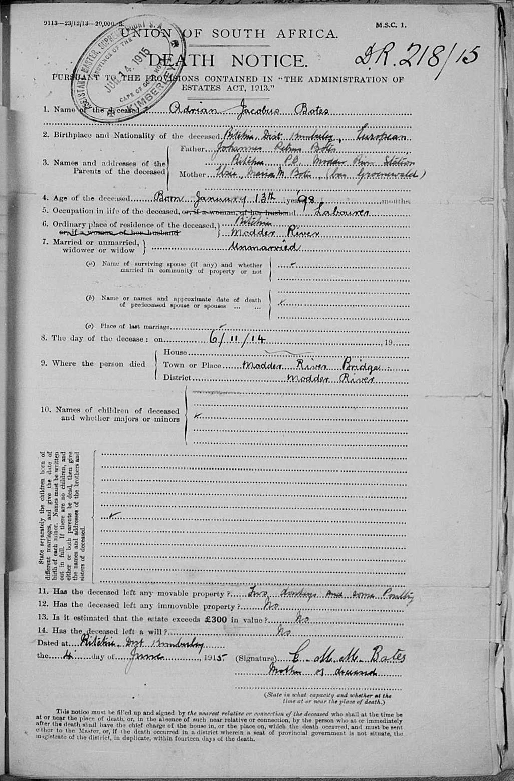 Son of Johannes Petrus and Elsie Maria Botes, of Modder River. ***Headstone has 6 December 1914. |