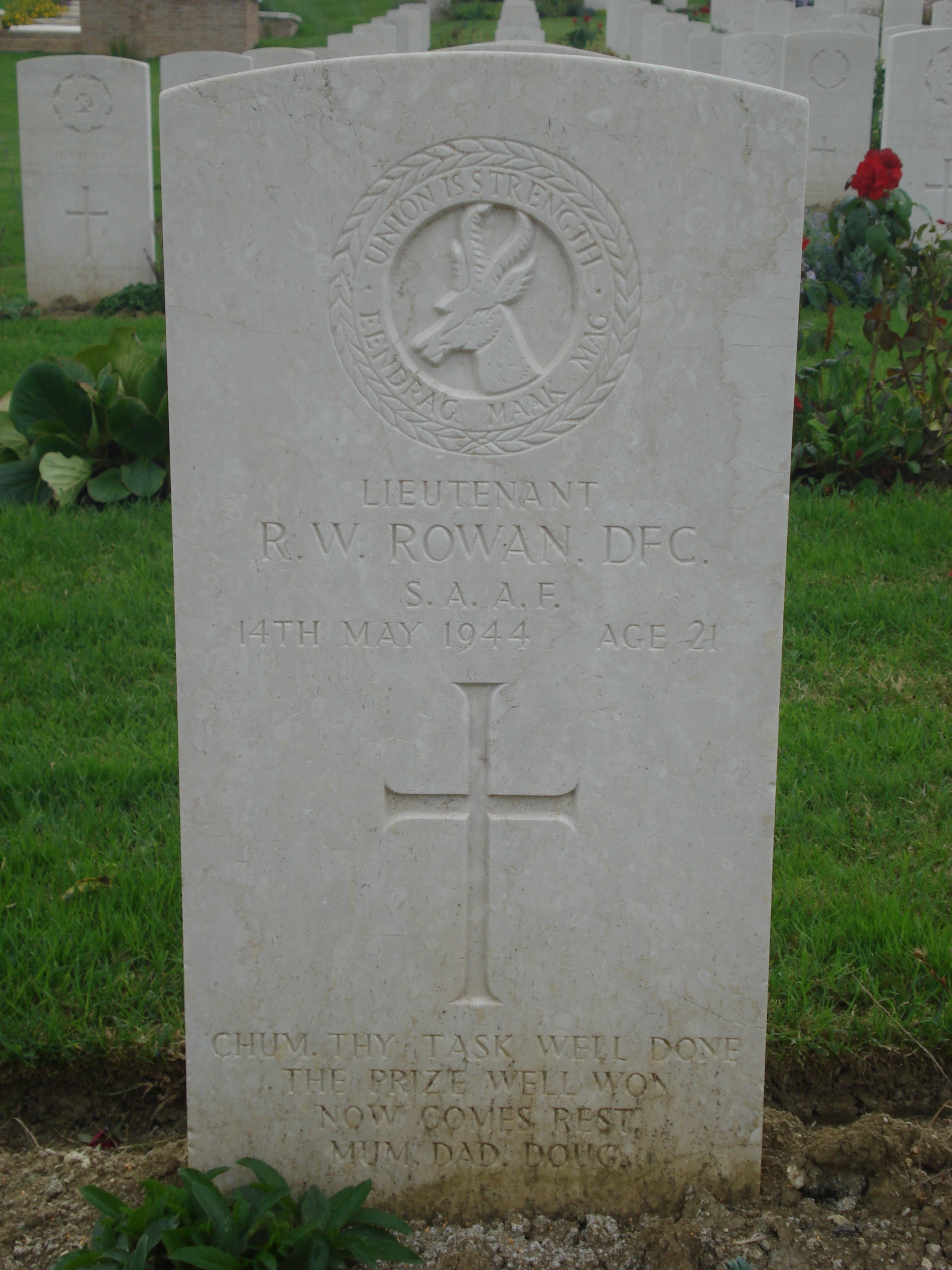 LG Sup 23 May 1944 pg. 2351 - "For tenacity, devotion to duty and continuous gallantry over a period of seventeen months in operations against the enemy in Africa, Sicily and Italy. Lieutenant Rowan has completed two hundred hours operational flying and has three enemy aircraft damaged to his credit. As a Flight Leader, this Officer has set a very high standard of aggressive and efficient flying. His courage, resolution and fighting spirit, combined with a strong personality, classify him as a Pilot of outstanding ability." |