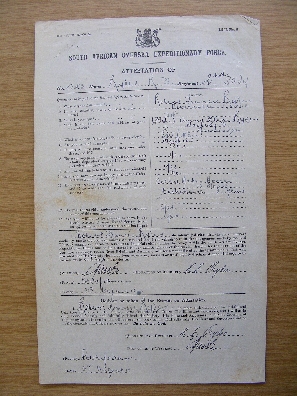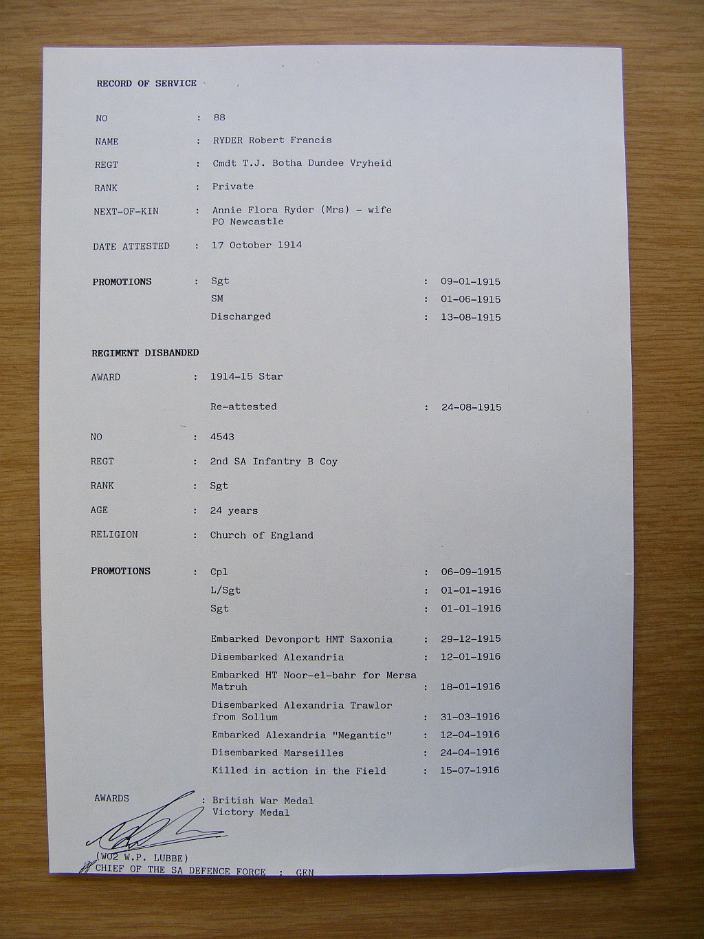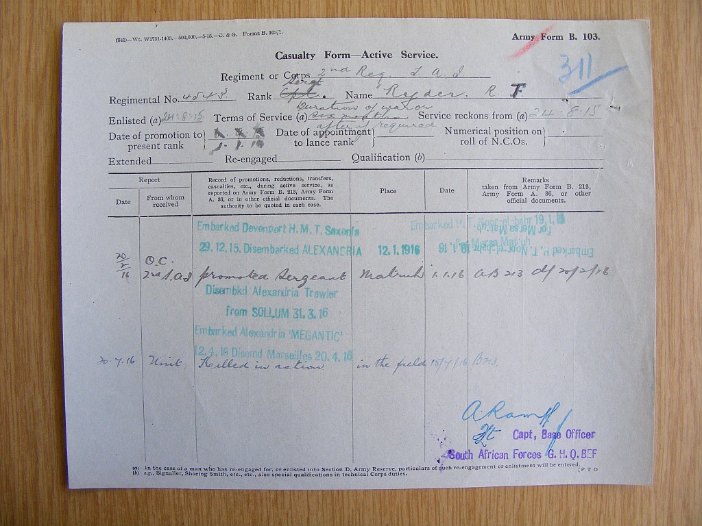 Son of Frances Ryder, of "Zimbalewe", Returned Soldiers Settlement, Newcastle, Natal, and the late Frank Ryder.