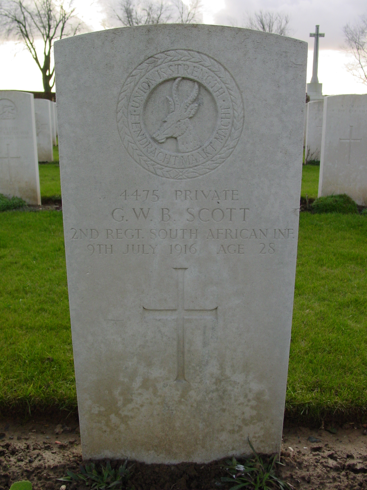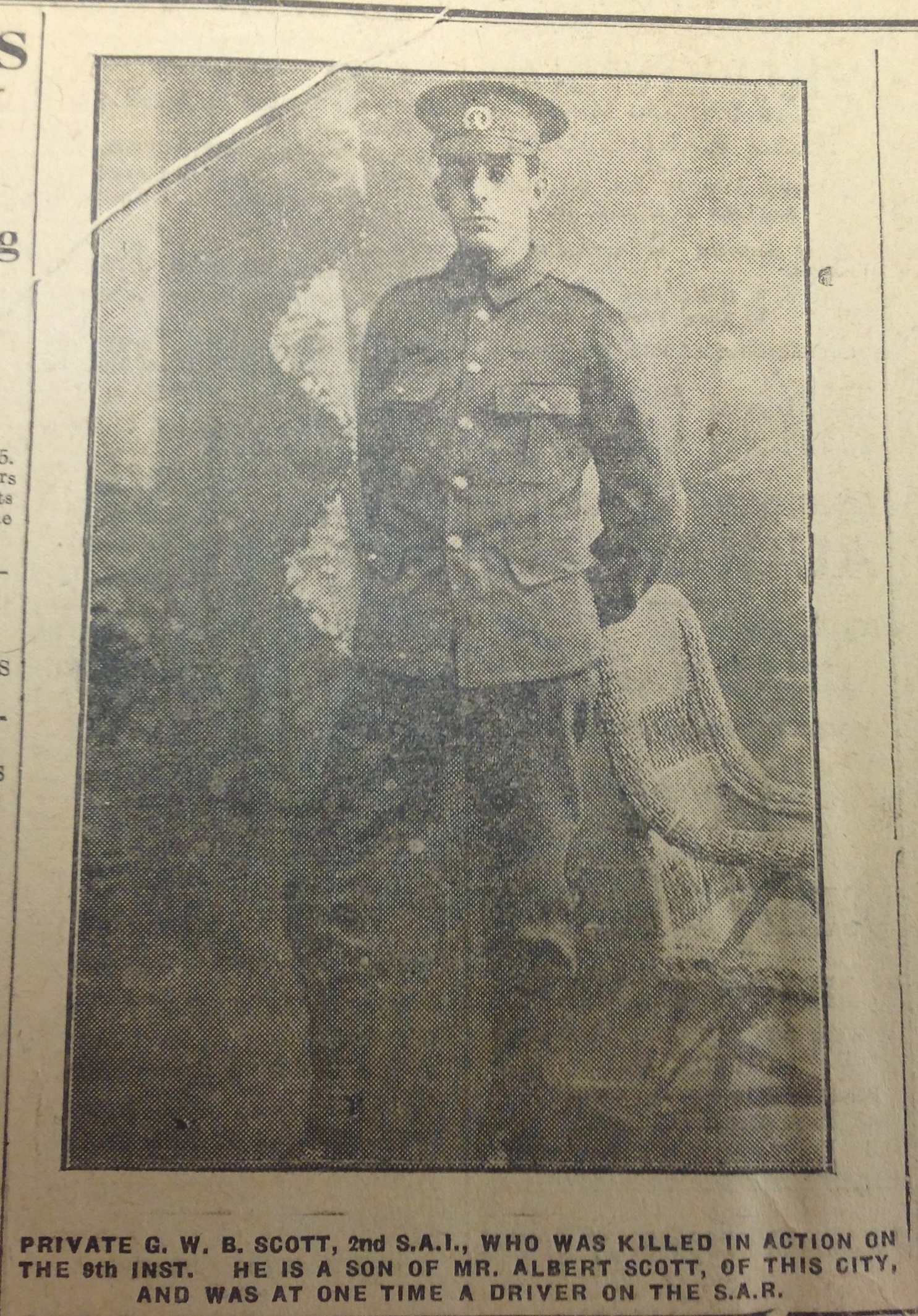 Son of Albert and Clara Scott, of 2, King St., Pietermaritzburg, Natal, South Africa. Born Swinton, Yorkshire, England. A railway engineman