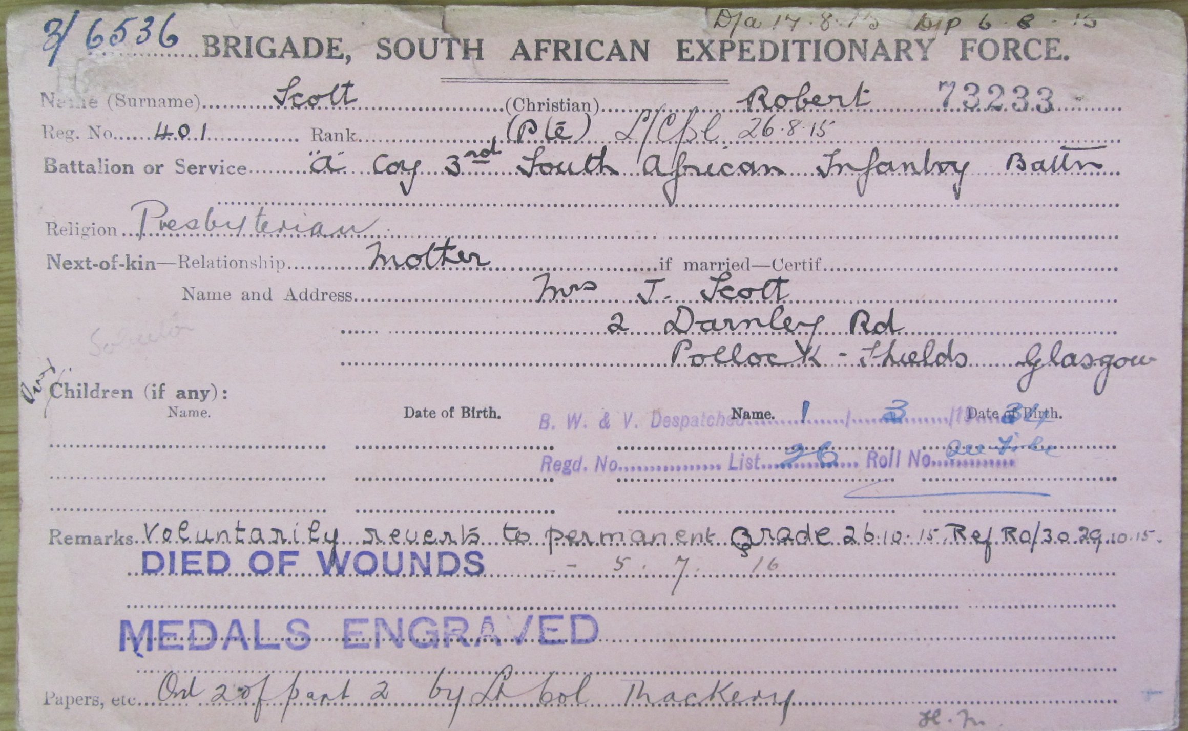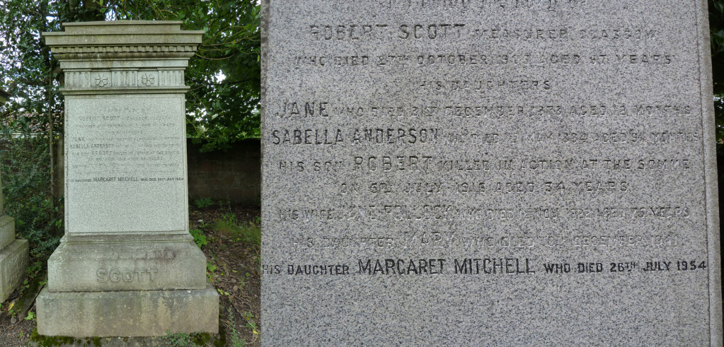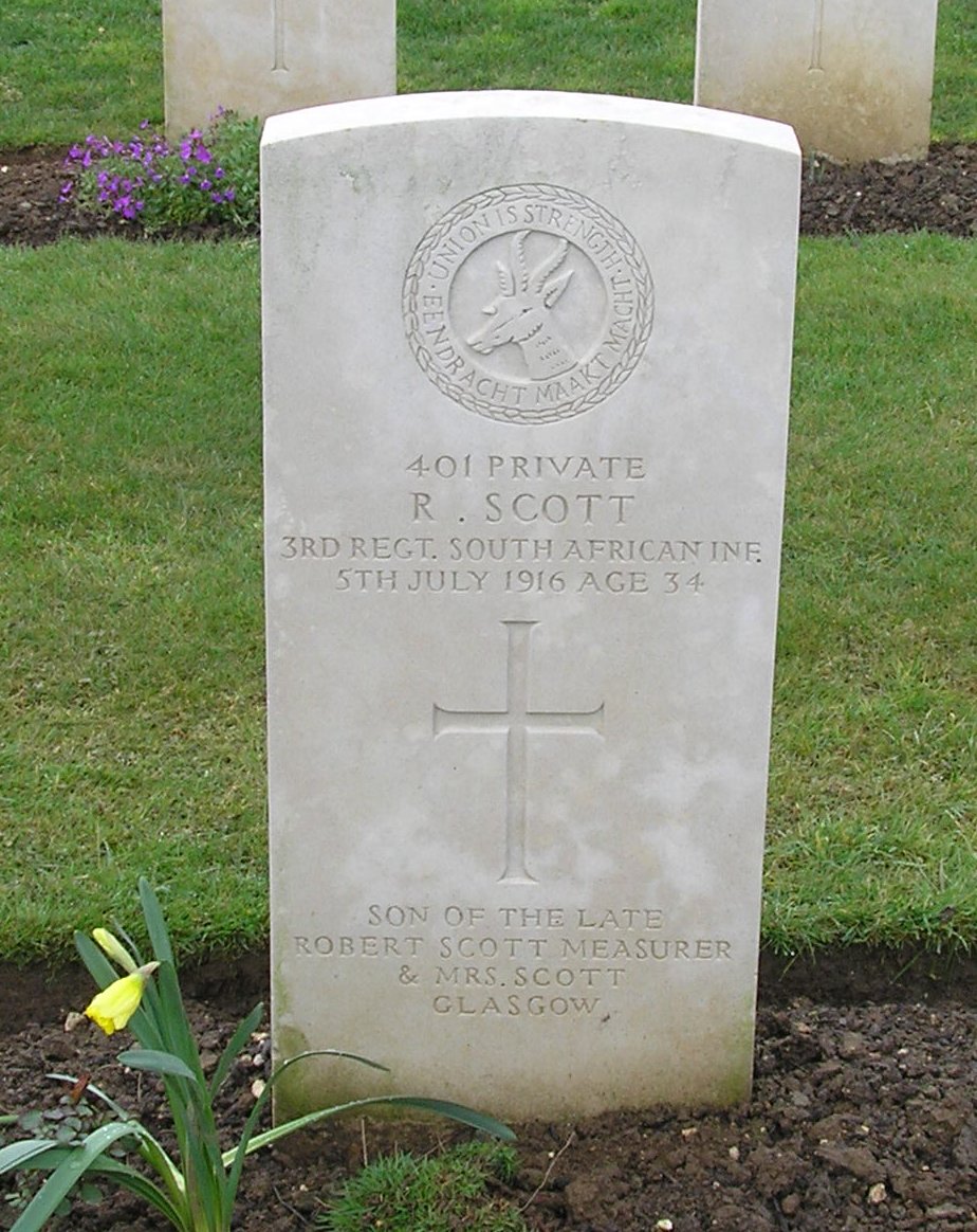 Son of Jane Scott, of 14, Darnley Rd., Pollokshields, Glasgow, Scotland and the late Robert Scott (Measurer). M.A., LL.B., of Glasgow University. Commemoration stone in New Kilpatrick Churchyard, Manse Road, Bearsden, Glasgow