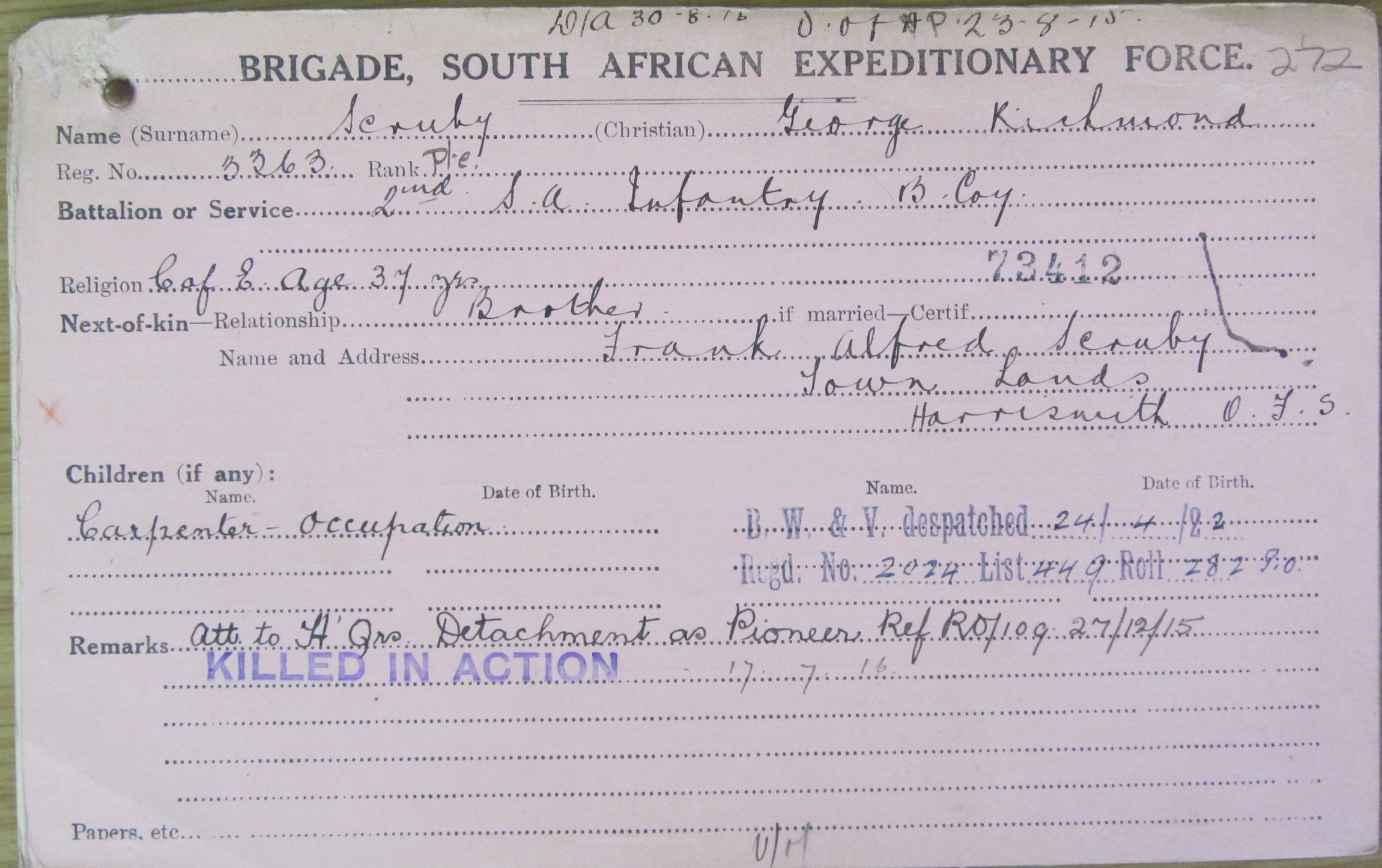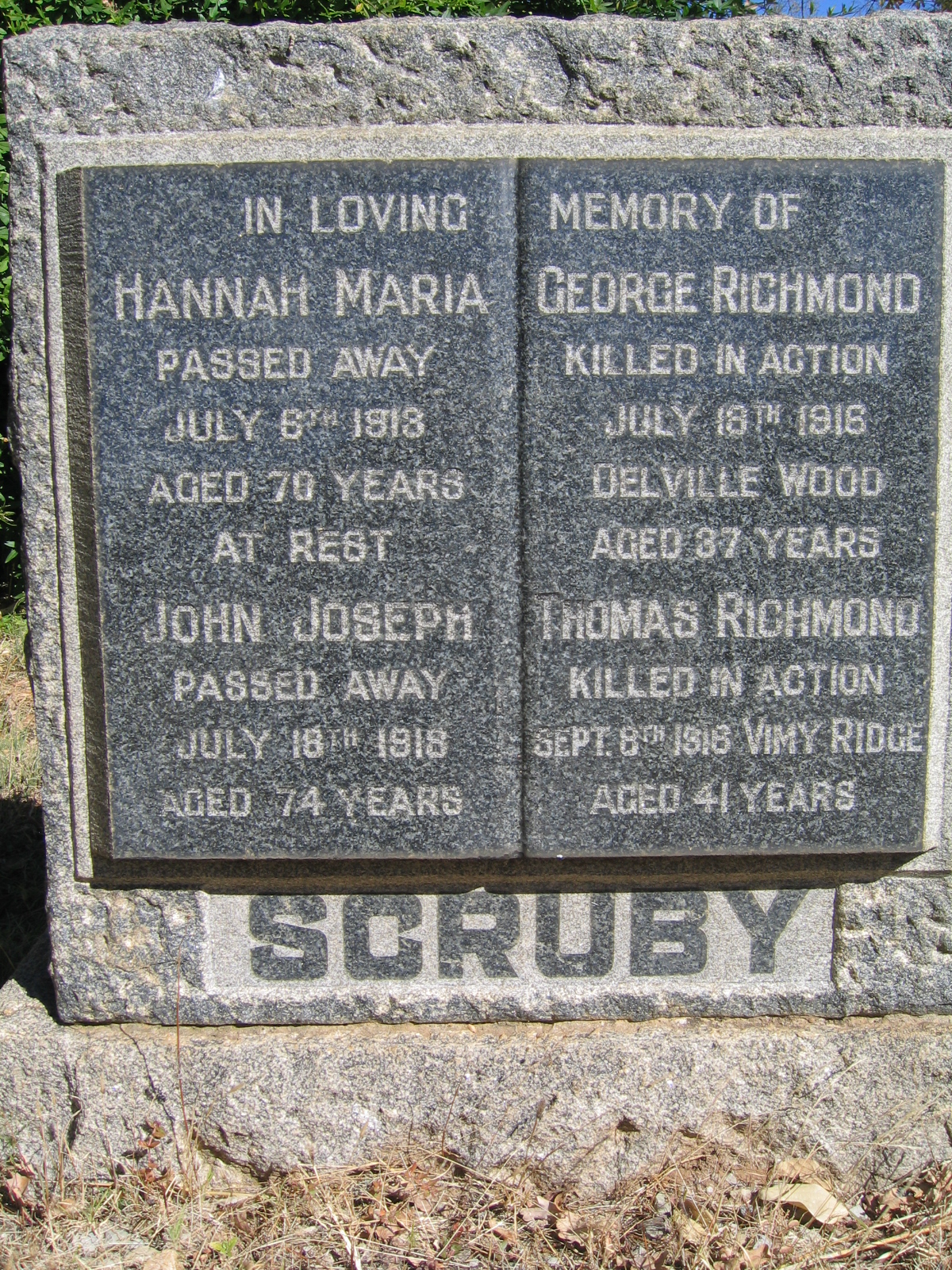 Son of John Joseph and Hannah Maria Scruby, of London, England. On Harrismith War Memorial, Free State. His brother also died on service. Commemoration stone in Harrismith Cemetery |