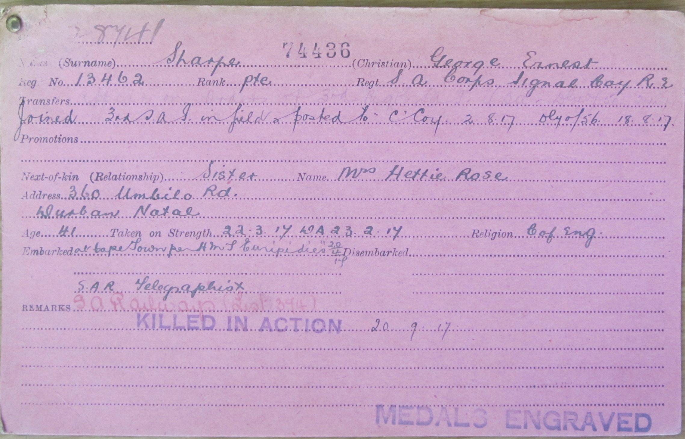 Killed in action, at Third Battle of Ypres (Battle of Menin Road) |